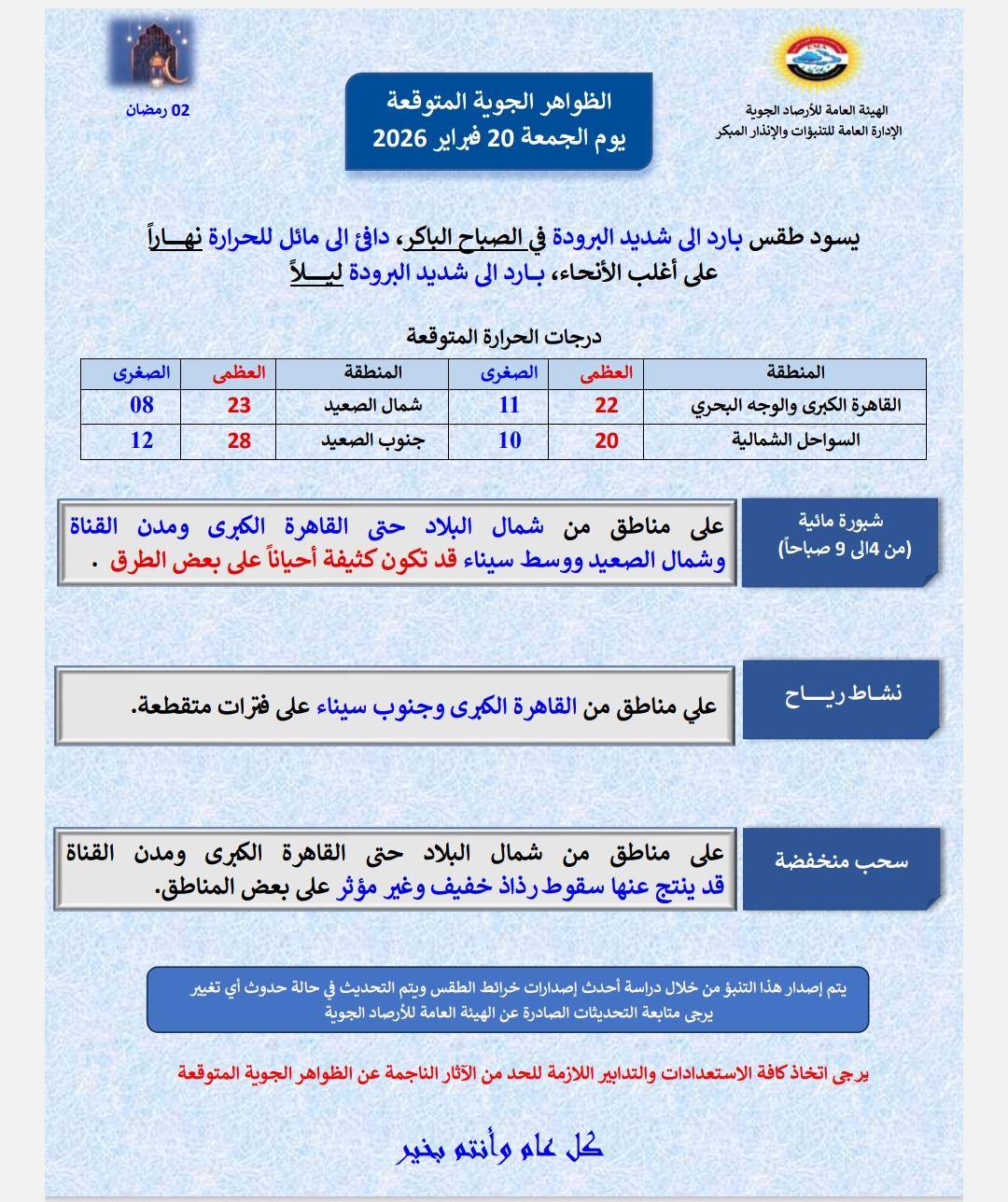 تشير التوقعات إلى أن طقس اليوم الجمعة 20 فبراير 2026 في ثاني أيام رمضان يشهد أجواء باردة إلى شديدة البرودة خلال ساعات الصباح الباكر، بينما يميل طقس اليوم إلى الدفء نهارًا على أغلب أنحاء الجمهورية، قبل أن تنخفض الحرارة مجددًا ليلًا ليصبح باردًا إلى شديد البرودة.