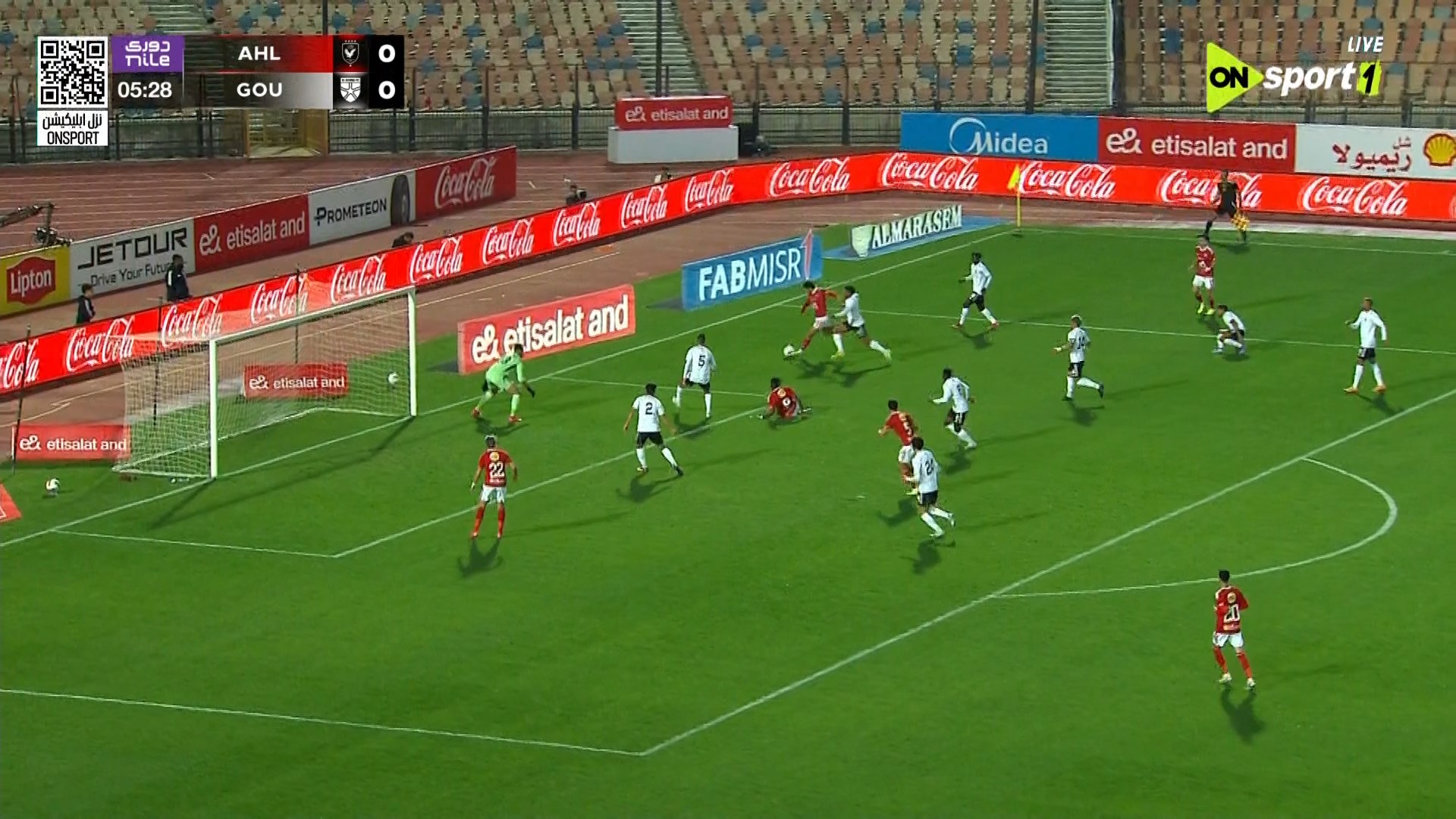 الدقيقة 8: تسديدة أولى من إمام عاشور، لاعب الأهلي، من خارج منطقة الجزاء ولكن مرت ضعيفة بجوار القائم الأيمن لمحمد علاء، حارس مرمى الجونة.