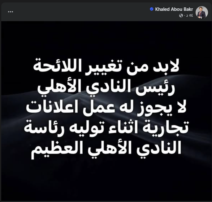 وكتب أبو بكر عبر صفحته الرسمية على "فيسبوك" أن لائحة النادي يجب أن تُعدَّل، مؤكدًا أنه لا يجوز لرئيس الأهلي الظهور في إعلانات تجارية أثناء توليه رئاسة "النادي الأهلي العظيم"، على حد وصفه.