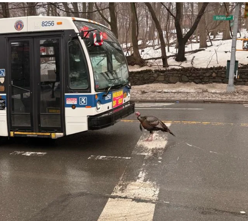 تسبب أحد الديوك الرومية البرية في توقف حركة المرور لفترة قليلة بمدينة نيويورك بعد أن خطا بجرأة مباشرة أمام حافلة تابعة لهيئة النقل الحضري.