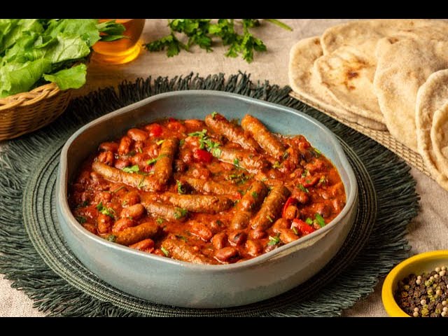 يُحمر السجق أولًا، ثم يُضاف الفول مع البهارات ويُترك لدقائق حتى يمتزج الطعم.