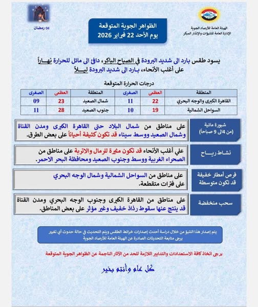 ونقدم لكم تفاصيل حالة الطقس اليوم الأحد 22 فبراير 2026 في مصر رابع يوم رمضان، وفق بيان الهيئة العامة للأرصاد الجوية.