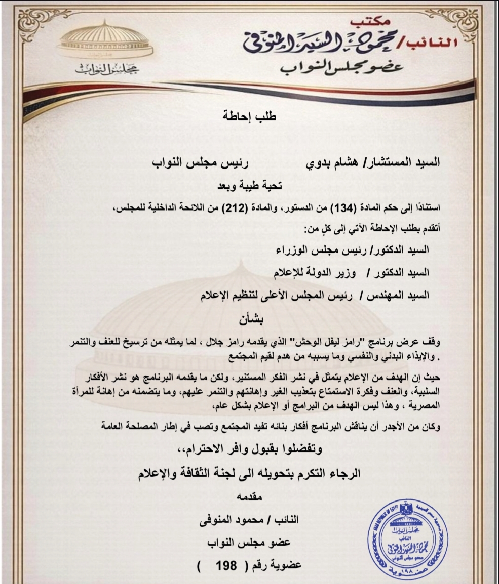 تقدم عضو مجلس النواب، محمود السيد المنوفي، بطلب إحاطة موجّه إلى رئيس الوزراء، ووزير الدولة للإعلام، ورئيس المجلس الأعلى لتنظيم الإعلام، مطالبًا بوقف عرض برنامج “رامز ليفل الوحش” الذي يقدمه الفنان رامز جلال، وذلك لما اعتبره تجاوزات تتنافى مع القيم المجتمعية ورسالة الإعلام.
