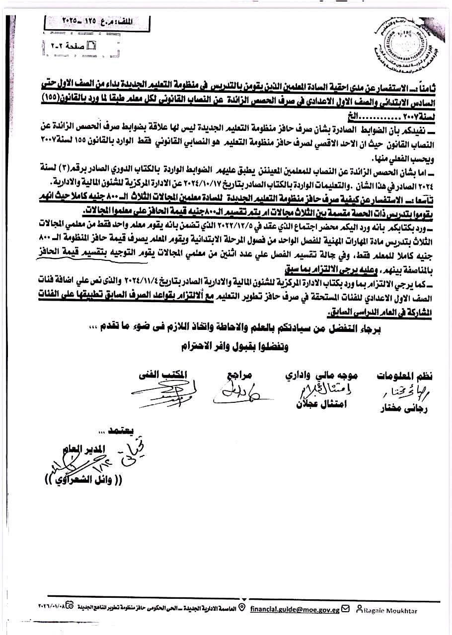 يقوم معلم واحد فقط من معلمي المجالات الثلاث بتدريس مادة المهارات المهنية للفصل الواحد من فصول المرحلة الابتدائية، ويقوم المعلم يصرف قيمة حافز المنظومة الـ 800 جنيه كاملا للمعلم فقط، وفي حالة تقسيم الفصل على عدد اثنين من معلمي المجالات يقوم التوجيه بتقسيم قيمة الحافز بالمناصفة بينهم، وعليه يرجى الالتزام بما سبق.