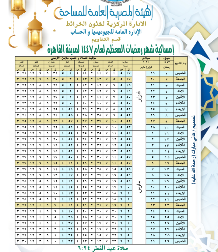 وتستعرض" تليجراف مصر" نتيجة رمضان 2026 وفقًا لما نشرته الهيئة العامة للمساحة كالتالي: