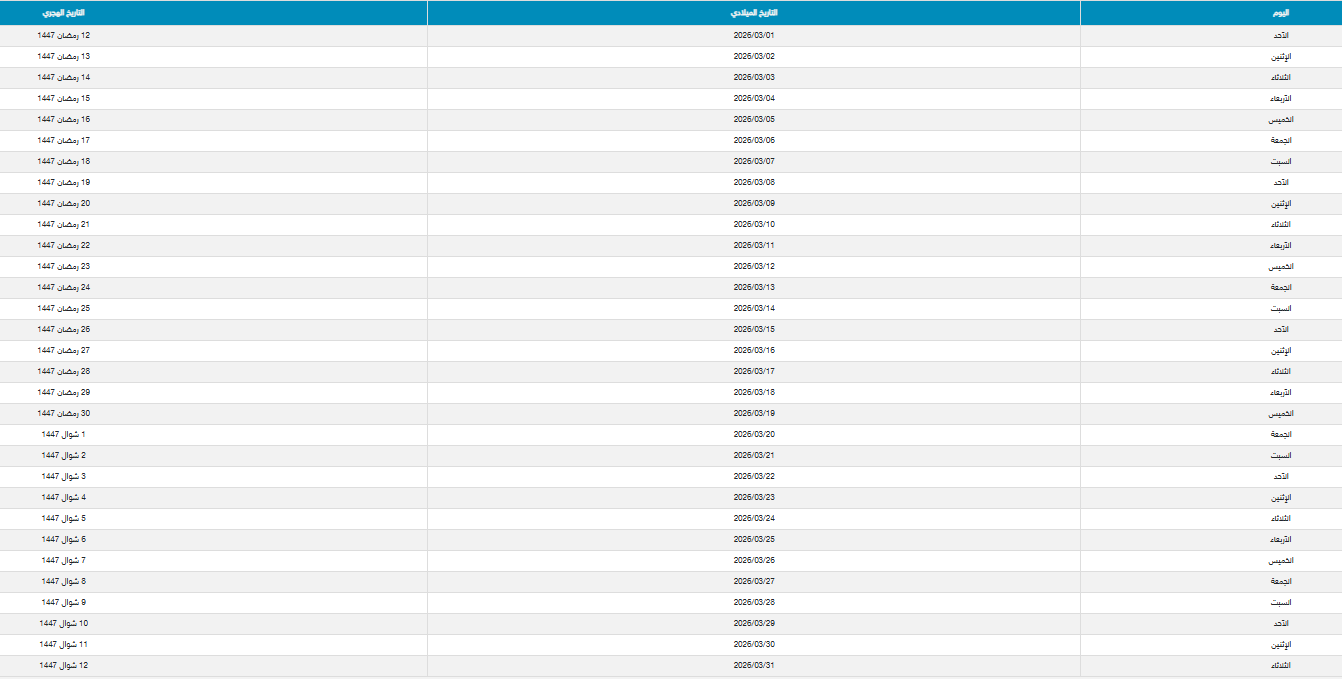 - 20 مارس – 22 مارس 2026: عيد الفطر المبارك.