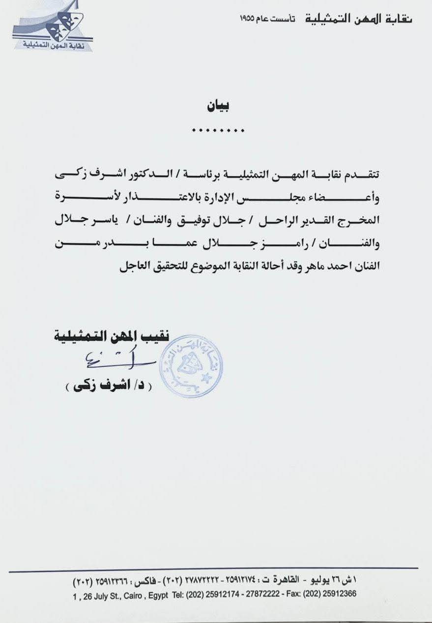 وأكد "عبدالعزيز"، في بيانه، أن الفنانين ياسر ورامز جلال يتابعان عن كثب وباهتمام بالغ سير إجراءات التحقيق التي تجريها حاليًا نقابة المهن التمثيلية برئاسة الدكتور أشرف زكي.