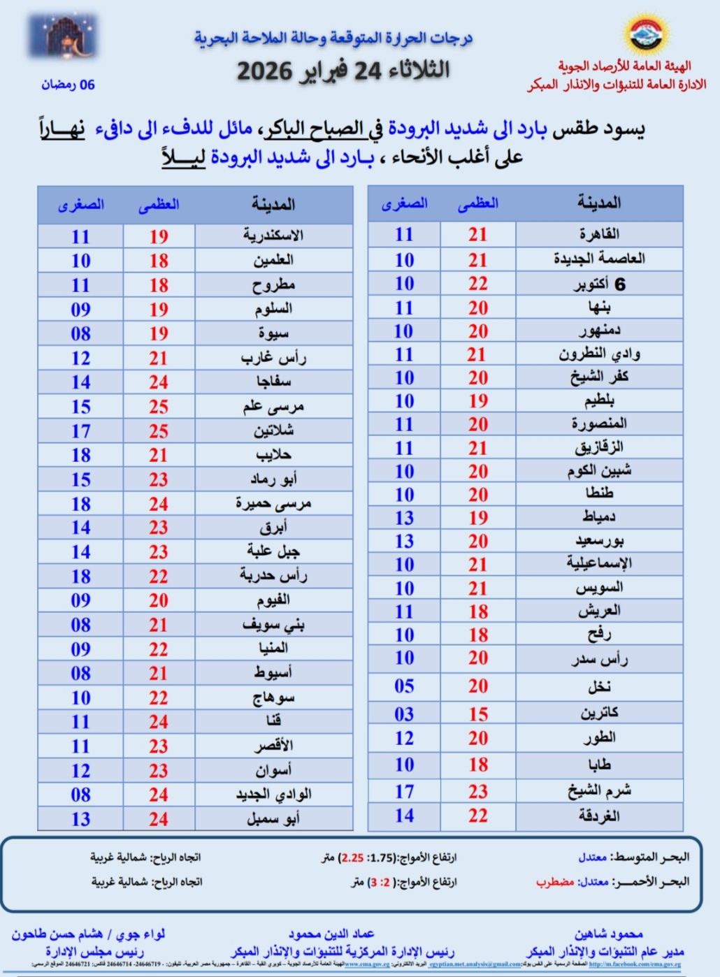 تشهد حالة الطقس اليوم الثلاثاء 24 فبراير 2026 سادس يوم رمضان اهتمامًا واسعًا مع متابعة توقعات الأجواء ودرجات الحرارة والظواهر الجوية المختلفة وفق البيانات الرسمية الصادرة عن الهيئة العامة للأرصاد الجوية، لمعرفة تفاصيل الطقس خلال ساعات اليوم.