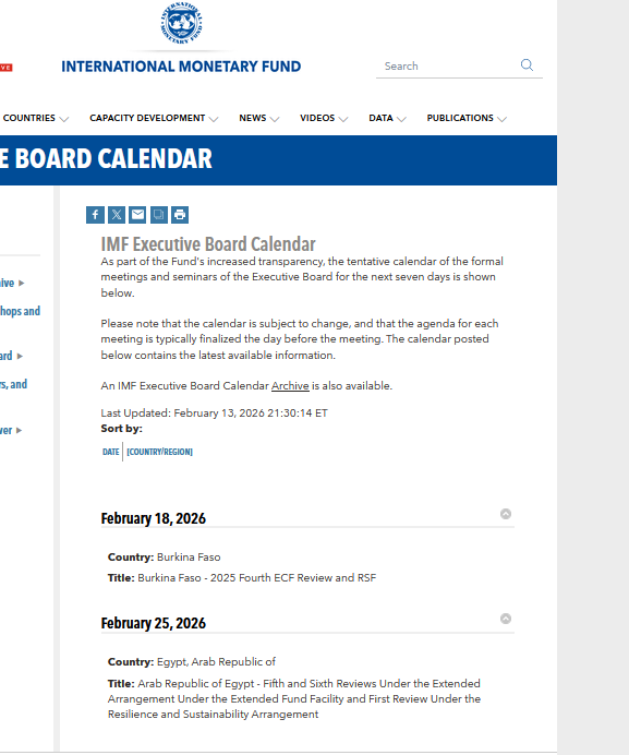 يعقد المجلس التنفيذي لصندوق النقد الدولي غدًا الأربعاء اجتماعًا على المستوى التنفيذي، لمناقشة واعتماد المراجعتين الخامسة والسادسة لبرنامج الإصلاح الاقتصادي الذي تنفذه مصر بالتعاون مع الصندوق.
