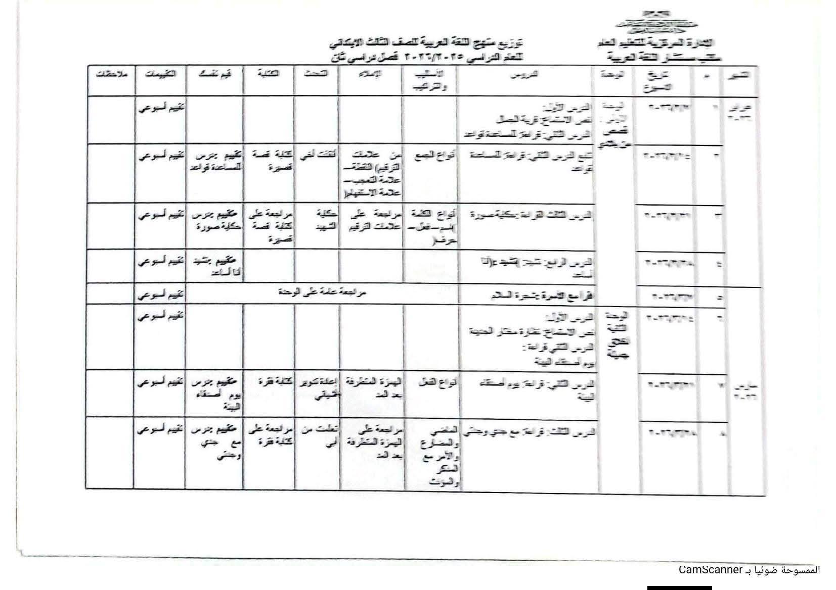 توزيع منهج اللغة العربية للصف الثالث الابتدائي الترم الثاني 2026