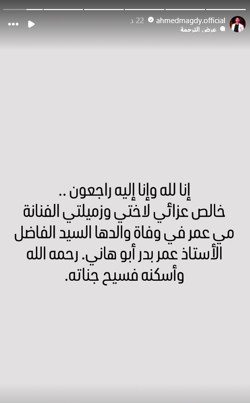 الفنان أحمد مجدي أول من نعى والد صديقته، وكتب عبر حسابه على “إنستجرام”: “إنا لله وإنا إليه راجعون، خالص عزائي لأختي وزميلتي الفنانة مي عمر في وفاة والدها السيد الفاضل الأستاذ عمر بدر أبو هاني، رحمه الله وأسكنه فسيح جناته”.
