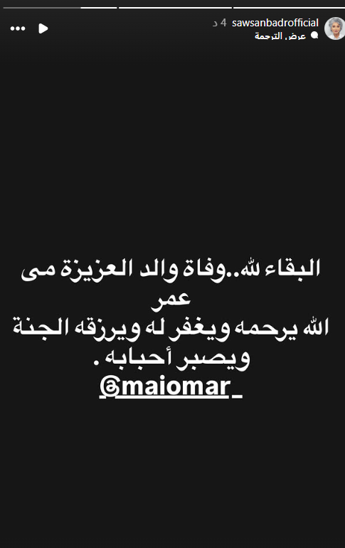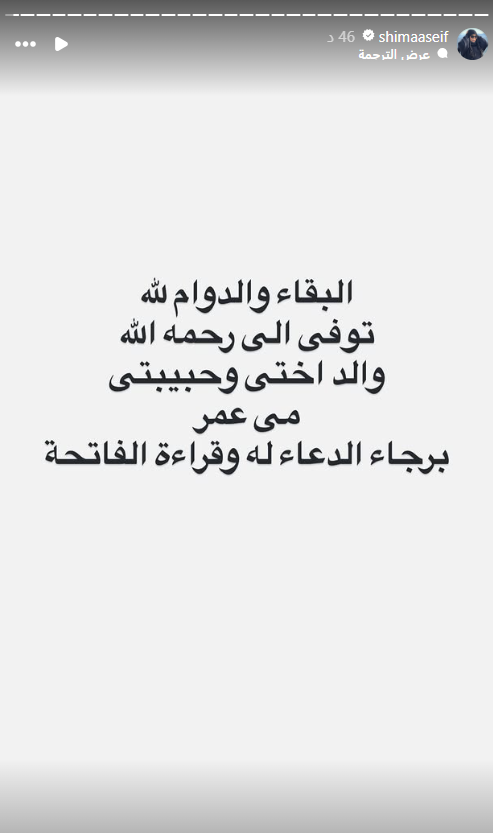 بينما كتبت الفنانة شيماء سيف بعض الكلمات المؤثرة عبر حسابها على “إنستجرام” قائلة: “البقاء والدوام لله، توفي إلى رحمة الله والد أختي وحبيبتي مي عمر.. برجاء الدعاء له وقراءة الفاتحة”.