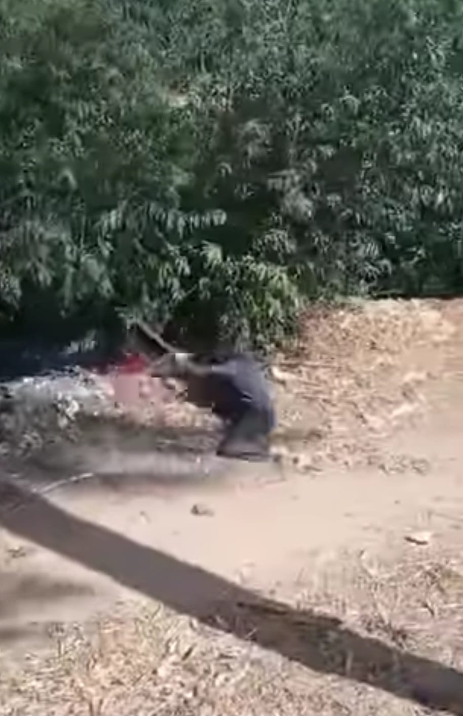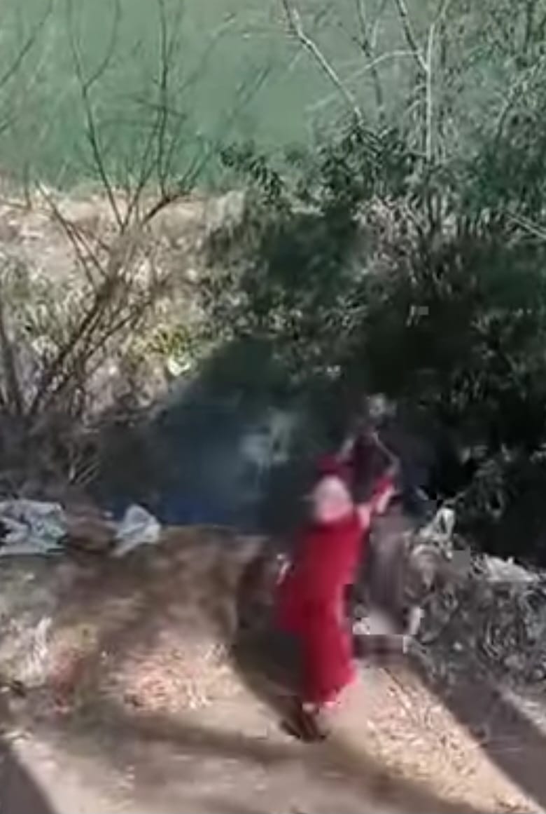 الفيديو يظهر فيه شخص يتهجم على منزل حاملًا في يده عصا خشبية تعدى بها على سيدة أمام المنزل ثم زج بها إلى ترعة مجاورة.