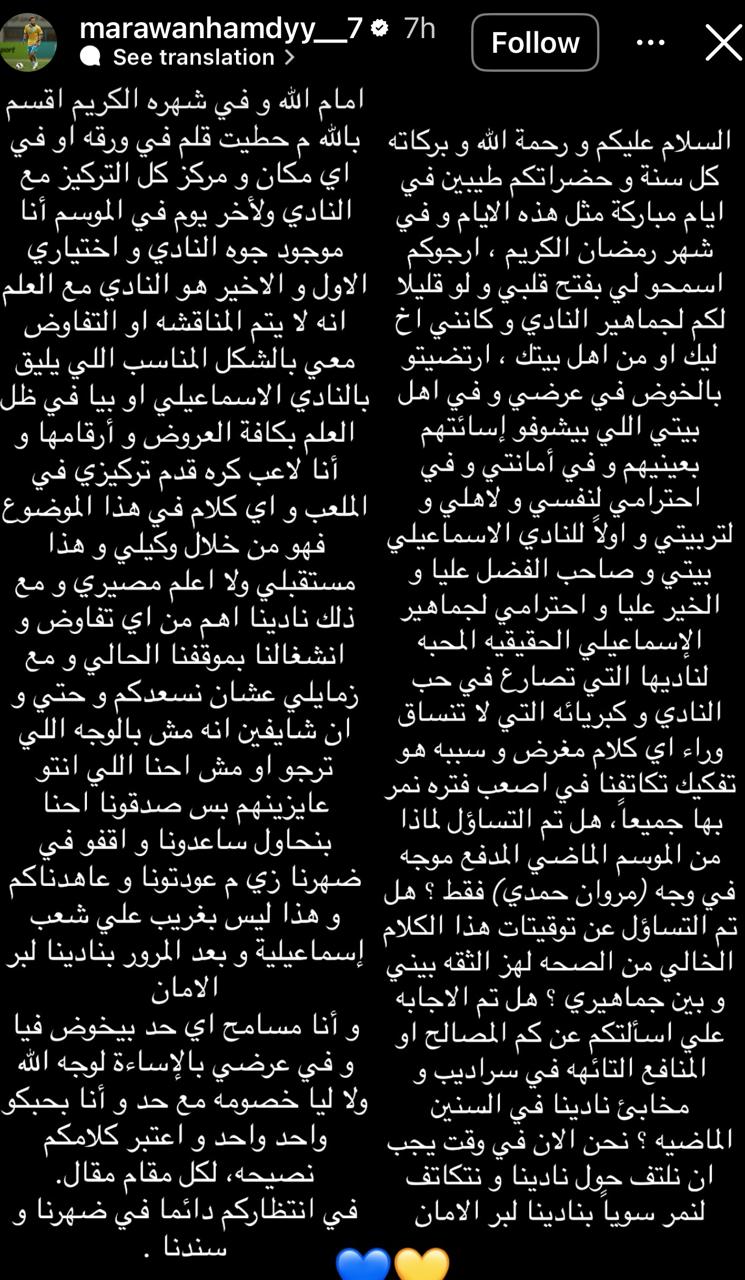 وقال مروان حمدي عبر حسابه الشخصي على “إنستجرام”: "السلام عليكم ورحمة الله وبركاته، كل عام وأنتم بخير في شهر رمضان الكريم، أود أن أفتح قلبي لجماهير النادي، كما لو كنت أحد أفراد أسرتكم، أؤكد احترامي وامتناني لنادي الإسماعيلي الذي أعتبره بيتي، ولجماهيره الحقيقية المحبة التي تفهم صعوبات النادي وتدعم وقوفنا معًا.