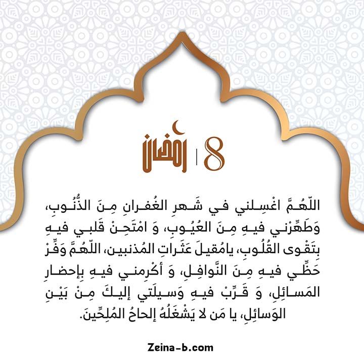 في اليوم الثامن من رمضان، يُستحب ترديد مجموعة من الأدعية التي تقرب العبد من الله وتطلب المغفرة والرحمة، ومنها: