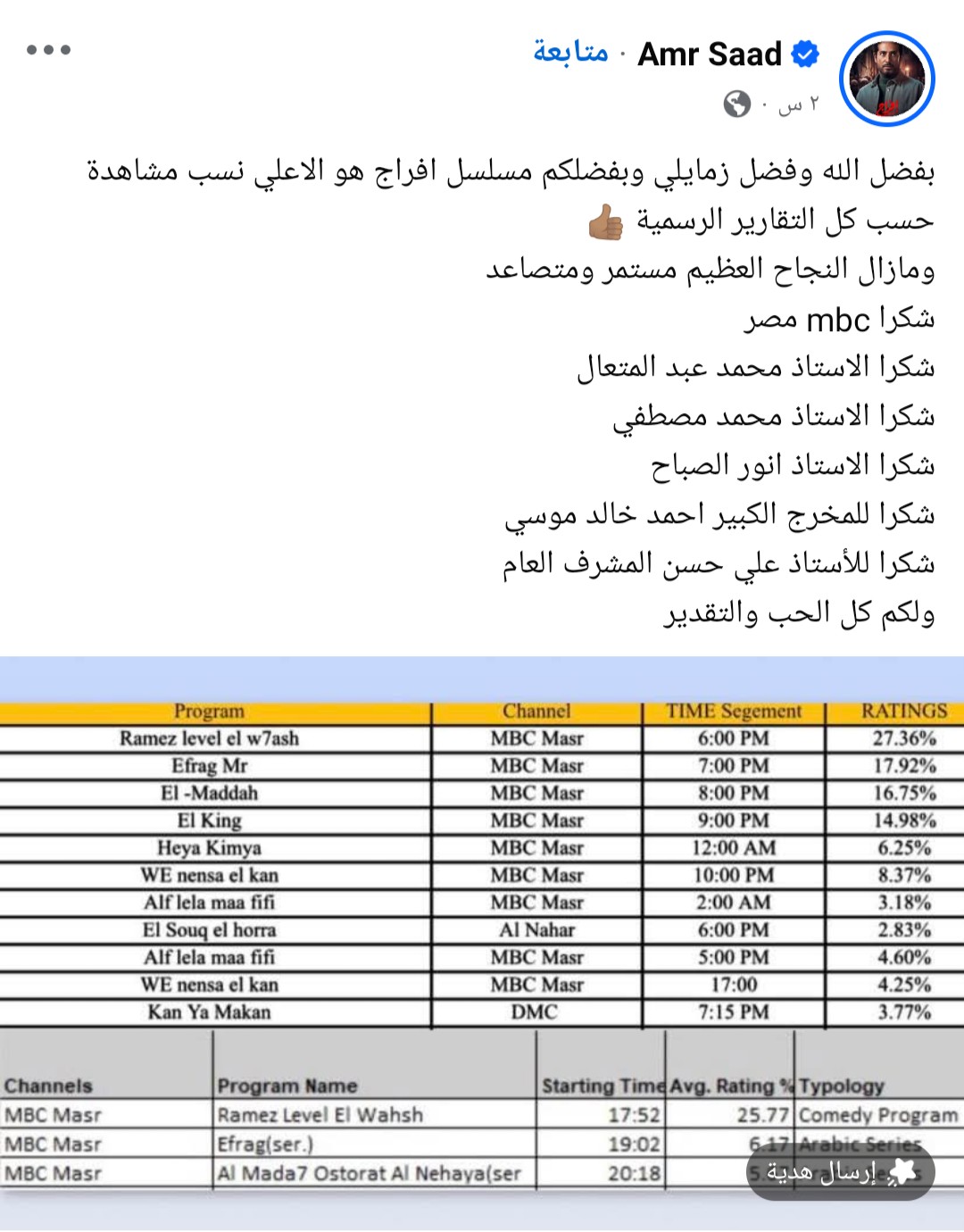 "إفراج" يواصل صعود سلم النجاح في رمضان.. وعمرو سعد يشكر 5 أشخاص