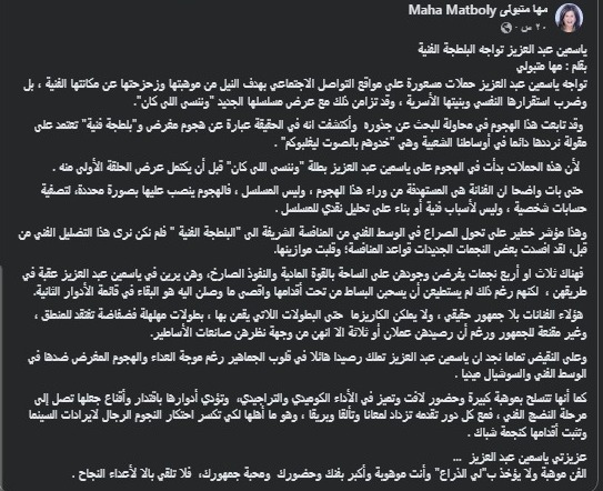 وكتبت مها متبولي عبر صفحتها على موقع فيسبوك: "تواجه ياسمين عبدالعزيز حملات مسعورة على مواقع التواصل الاجتماعي بهدف النيل من موهبتها وزحزحتها عن مكانتها الفنية ، بل وضرب استقرارها النفسي وبنيتها الأسرية ، وقد تزامن ذلك مع عرض مسلسلها الجديد "وننسى اللى كان".