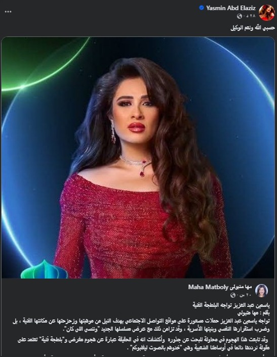 انتقدت الكاتبة والناقدة الفنية مها متبولي، حالة الهجوم الواسعة التي تواجهها الفنانة ياسمين عبدالعزيز تزامنًا مع عرض مسلسلها الرمضاني" وننسى اللي كان"، لتعيد الفنانة نشر المنشور معلقة “حسبي الله ونعم الوكيل”.