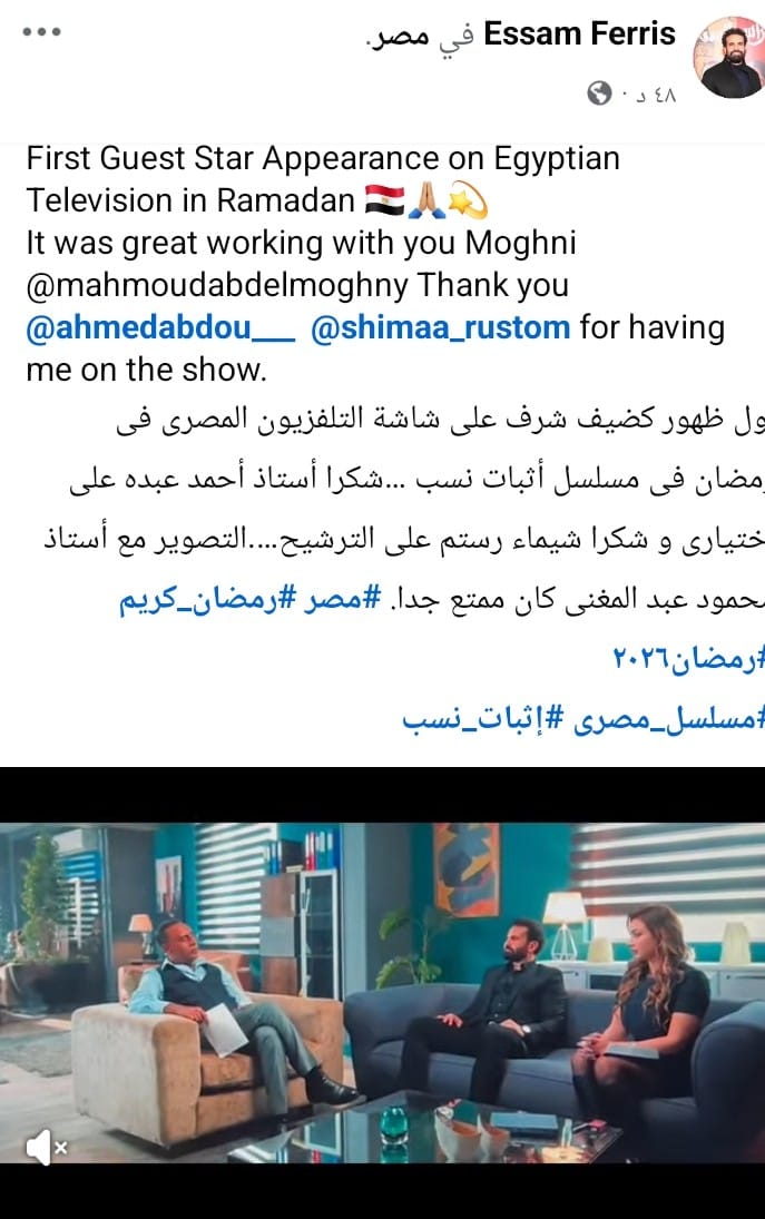 يخوض الممثل المصري الأمريكي عصام فارس أولى تجاربه في الدراما المصرية، من خلال مشاركته في مسلسل إثبات نسب، المعروض ضمن سباق رمضان 2026، حيث يظهر كضيف شرف بشخصية “علاء”.