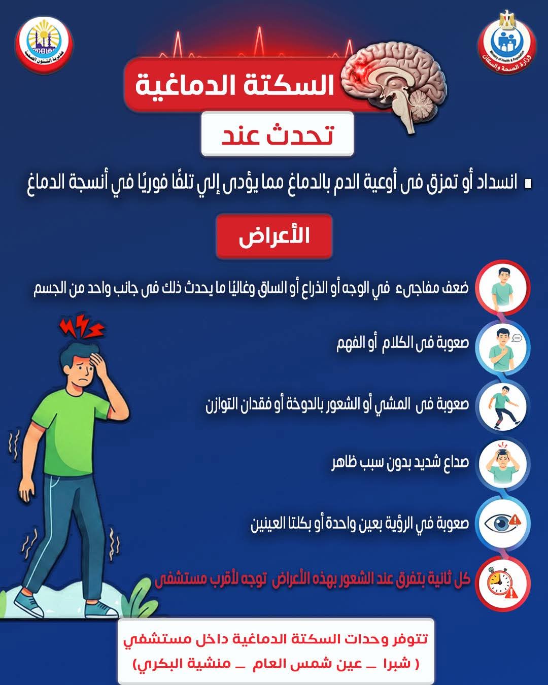 وأكدت المديرية أن كل ثانية تُحدث فارقًا في فرص النجاة والشفاء، مشددة على أهمية التوجه الفوري لأقرب مستشفى مجهزة بوحدة سكتة دماغية فور ظهور الأعراض، لضمان تلقي الرعاية الطبية وفقًا للبروتوكولات العلاجية المعتمدة.