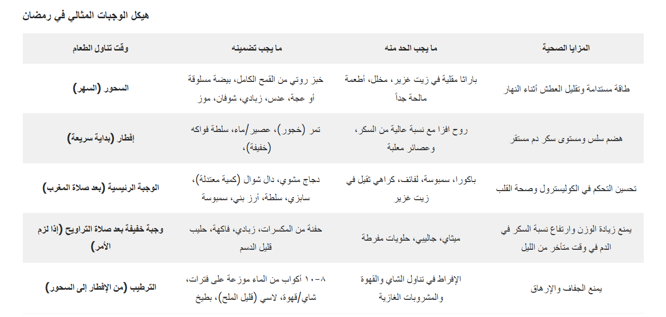 ويحتاج الصيام خلال شهر رمضان إلى قدر كبير من الوعي والاعتدال في العادات الغذائية، إذ يمكن أن يسهم في تحسين كفاءة التمثيل الغذائي ودعم الصحة، شريطة الالتزام بنظام متوازن ومنضبط.