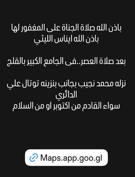 من المقرر تشييع جثمان الراحلة بعد صلاة العصر من المسجد الكبير بالقلج قرب المرج، على أن تُوارى الثرى بمقابر العائلة بحضور الأهل والأصدقاء والمقربين."