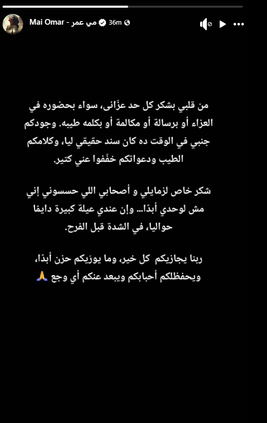 وكتبت مي عمر عبر حسابها على منصة “فيسبوك”: “من قلبي بشكر كل حد عزاني، سواء بحضوره في العزاء أو برسالة أو مكالمة أو بكلمة طيبة.. وجودكم جنبي في الوقت ده كان سند حقيقي ليا، وبكلامكم الطيب ودعواتكم خففوا عني كتير”.