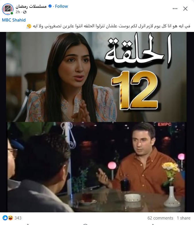 وكتبت متابعة عبر منصة “فيسبوك” بشكل كوميدي: “في إيه هو أنا كل يوم لازم أنزلكم بوست علشان تنزلوا الحلقة أنتوا عايزين تصغروني ولا إيه” في إشارة إلى الحساب الرسمي لمنصة “شاهد”.