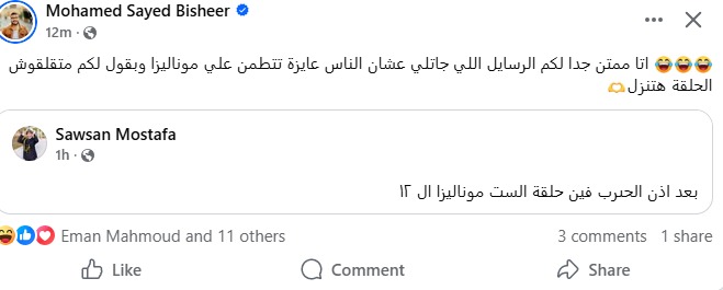 وكتب محمد سيد بشير عبر منصة “فيسبوك”: “أنا ممتن جدًا لـ كم الرسايل اللي جاتلي علشان الناس عايزة تطمن على موناليزا وبقول لكم متقلقوش الحلقة هتنزل”.