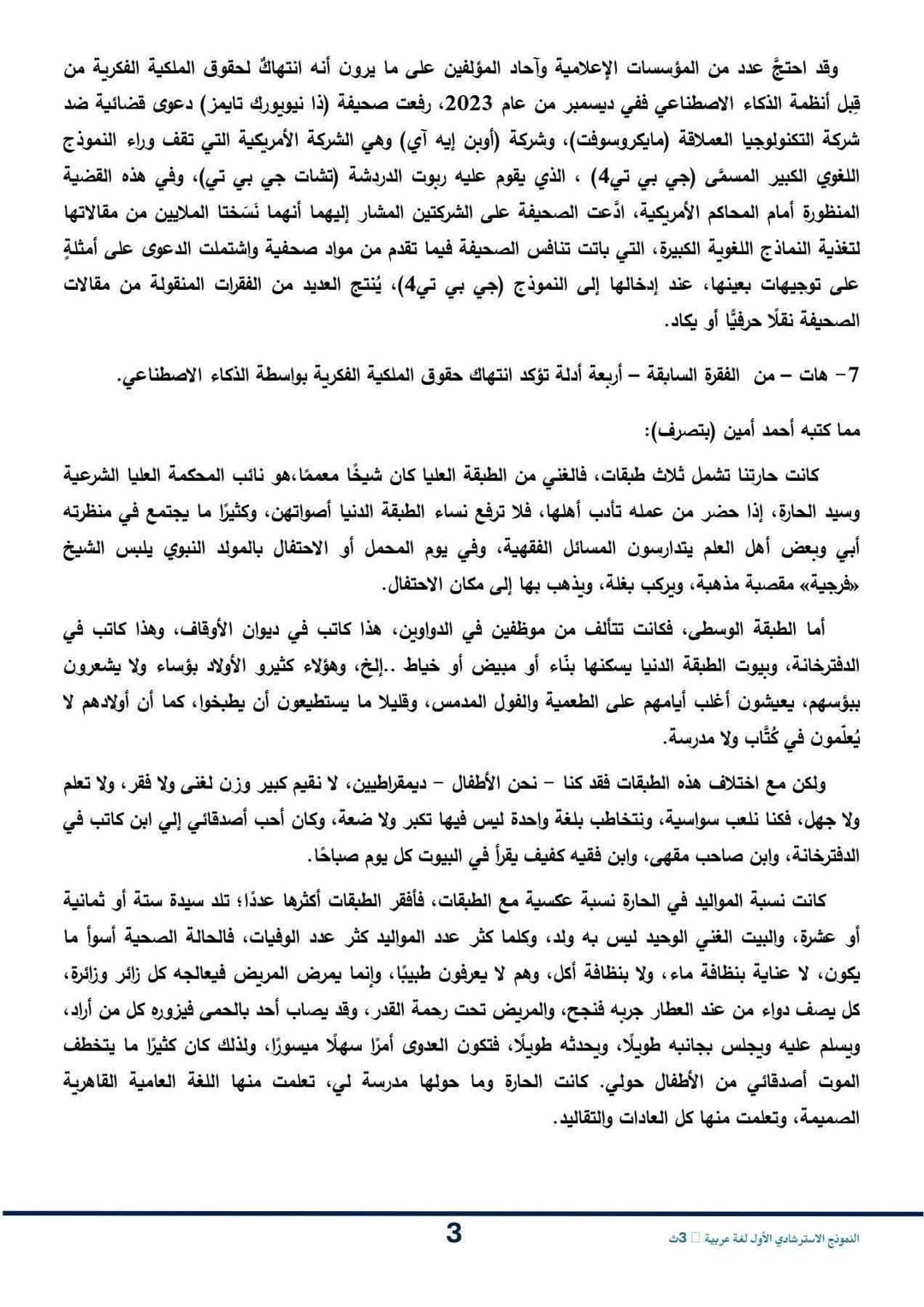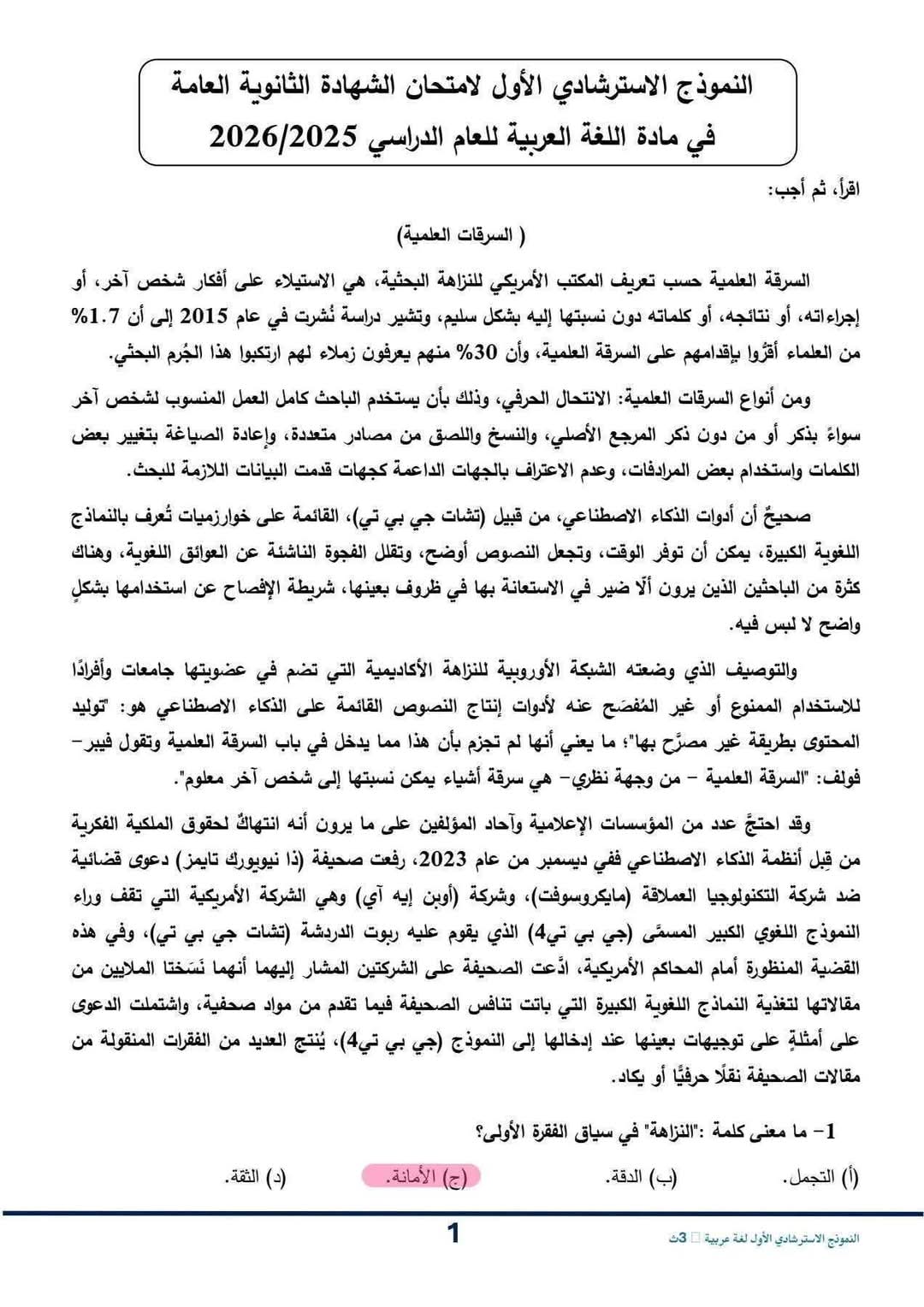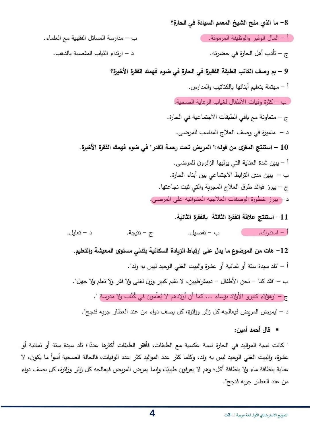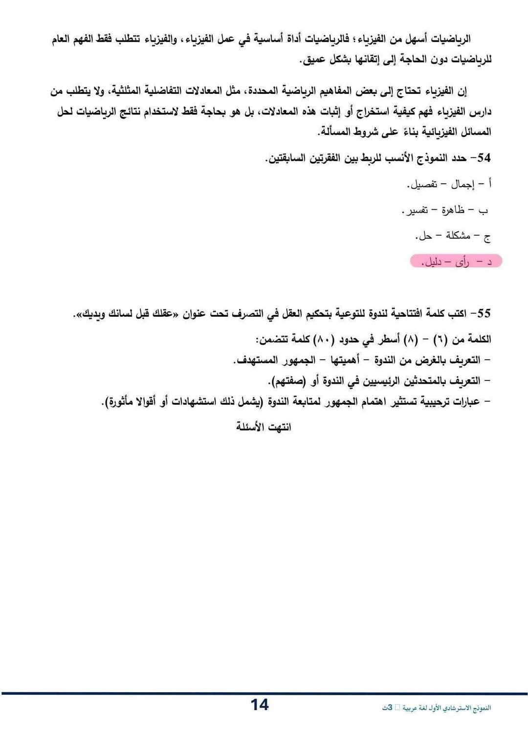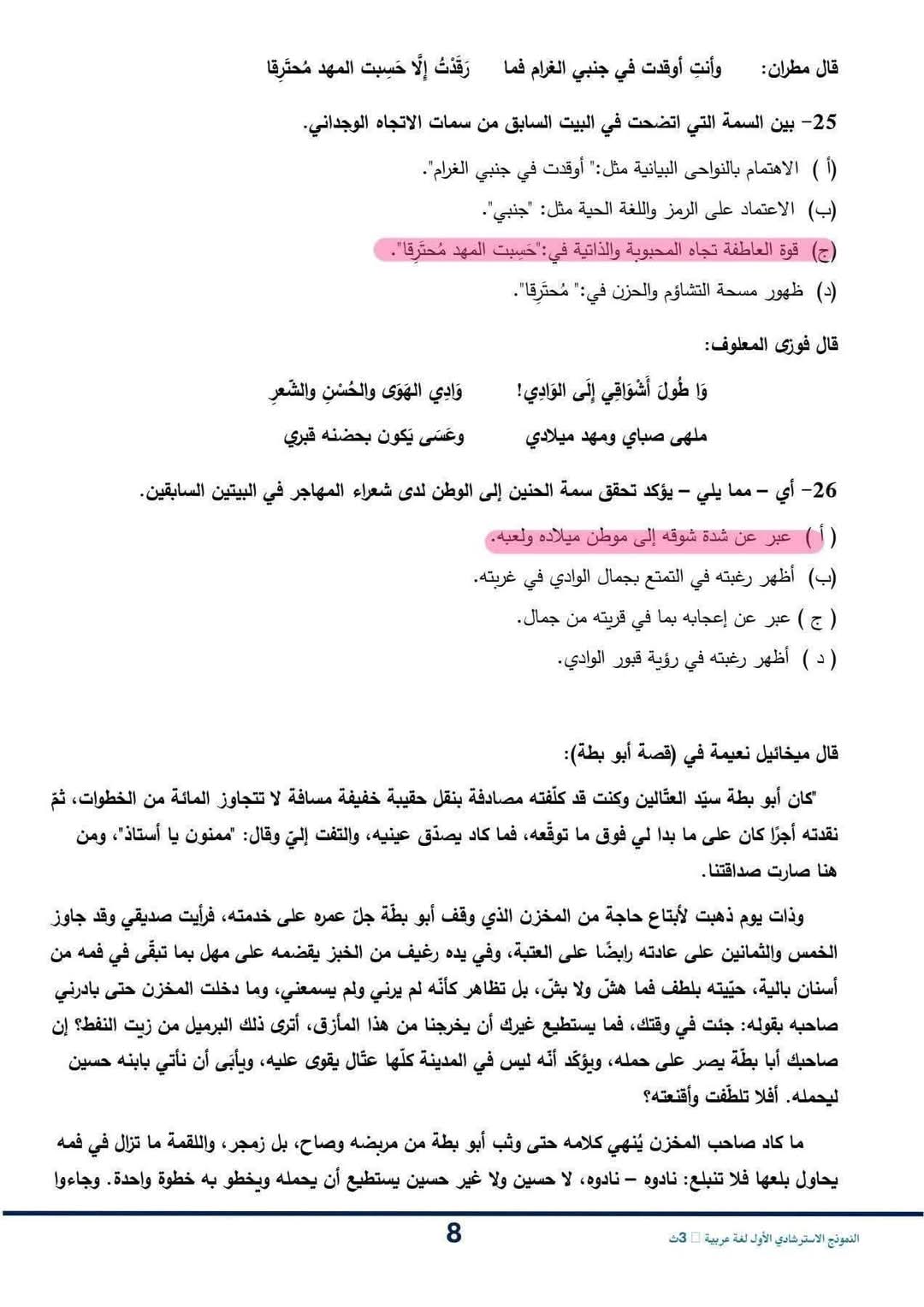 حل النموذج الاسترشادي عربي للصف الثالث الثانوي 2026