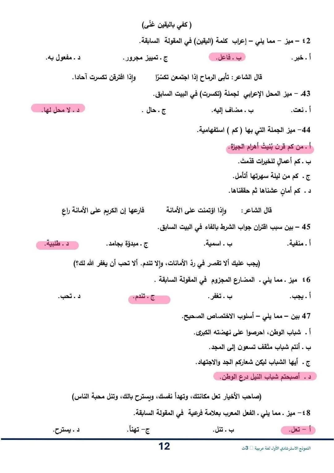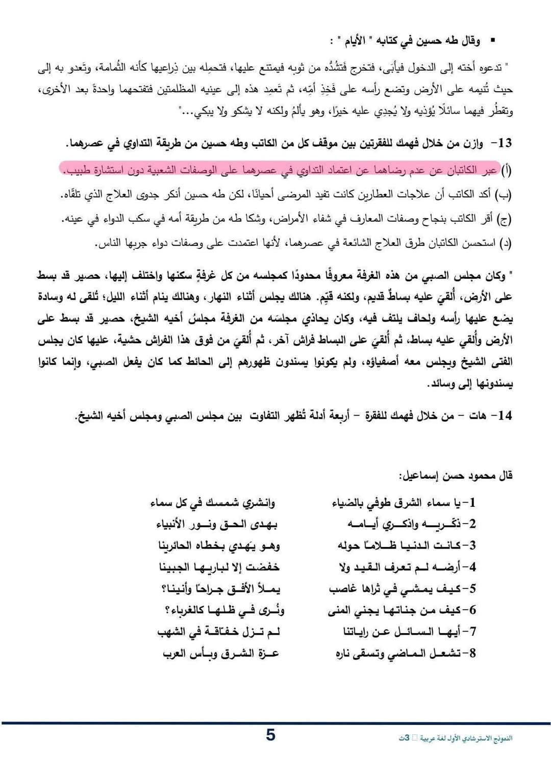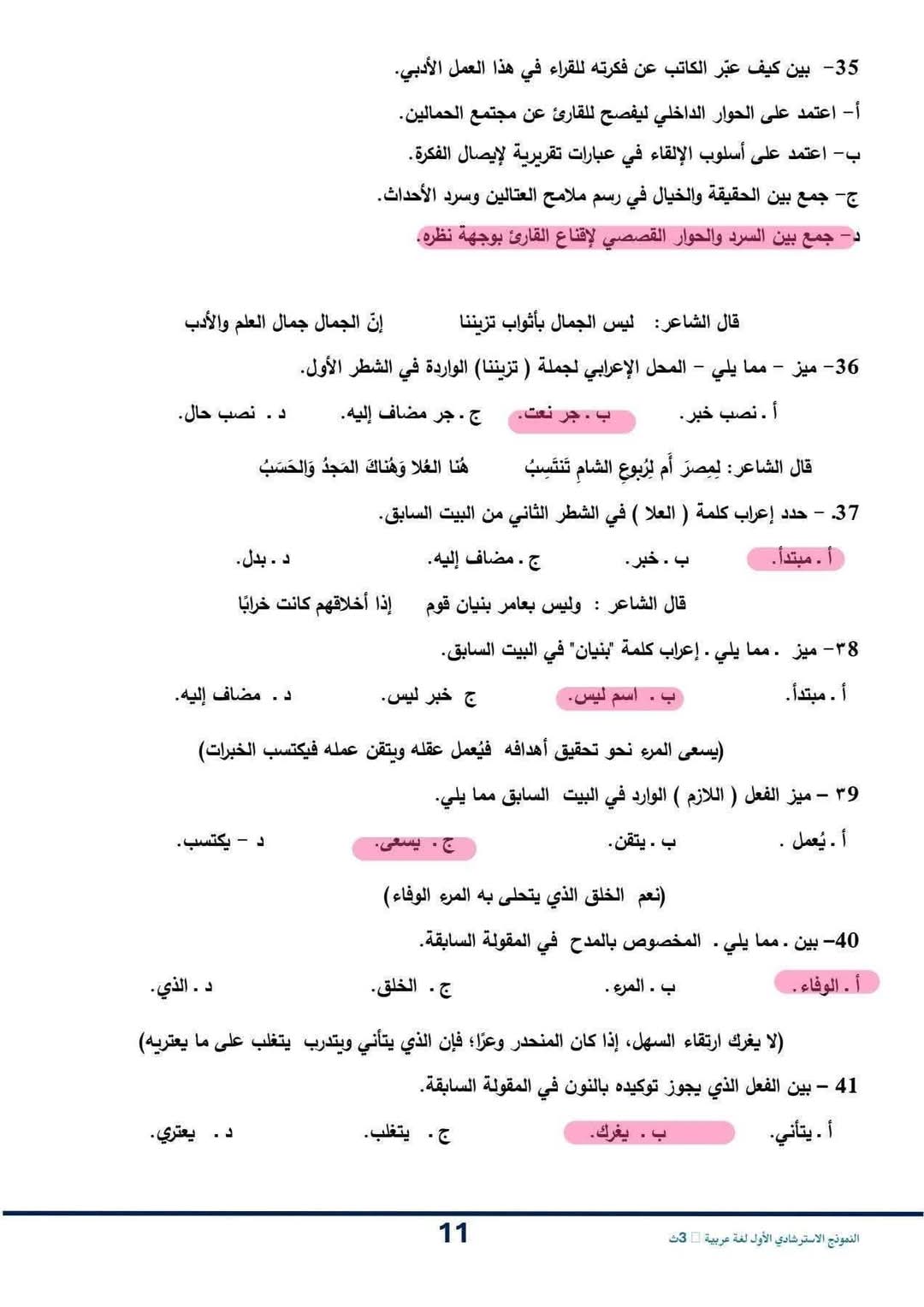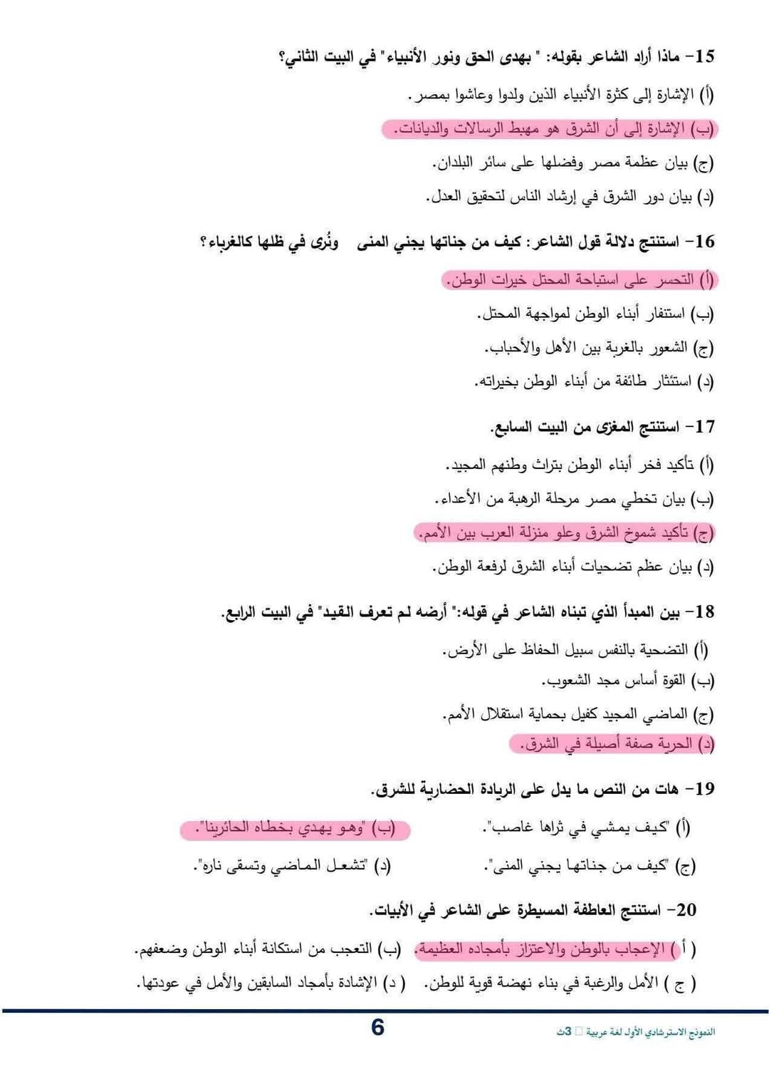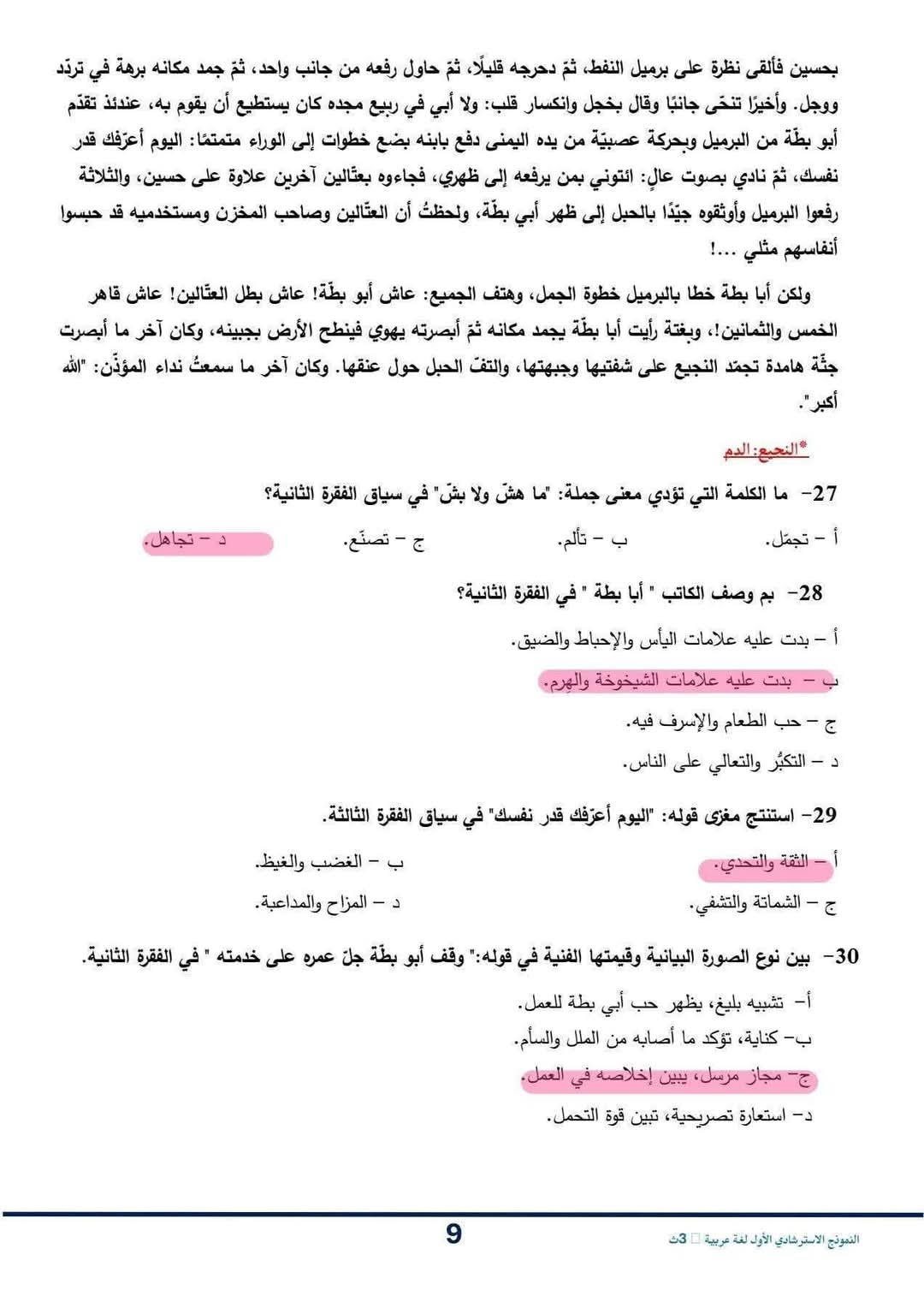 حل النموذج الاسترشادي للصف الثالث الثانوي اللغة العربية