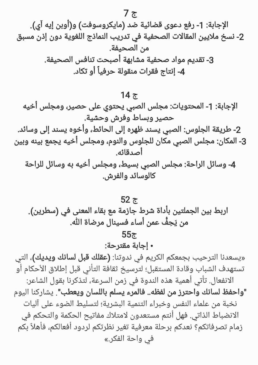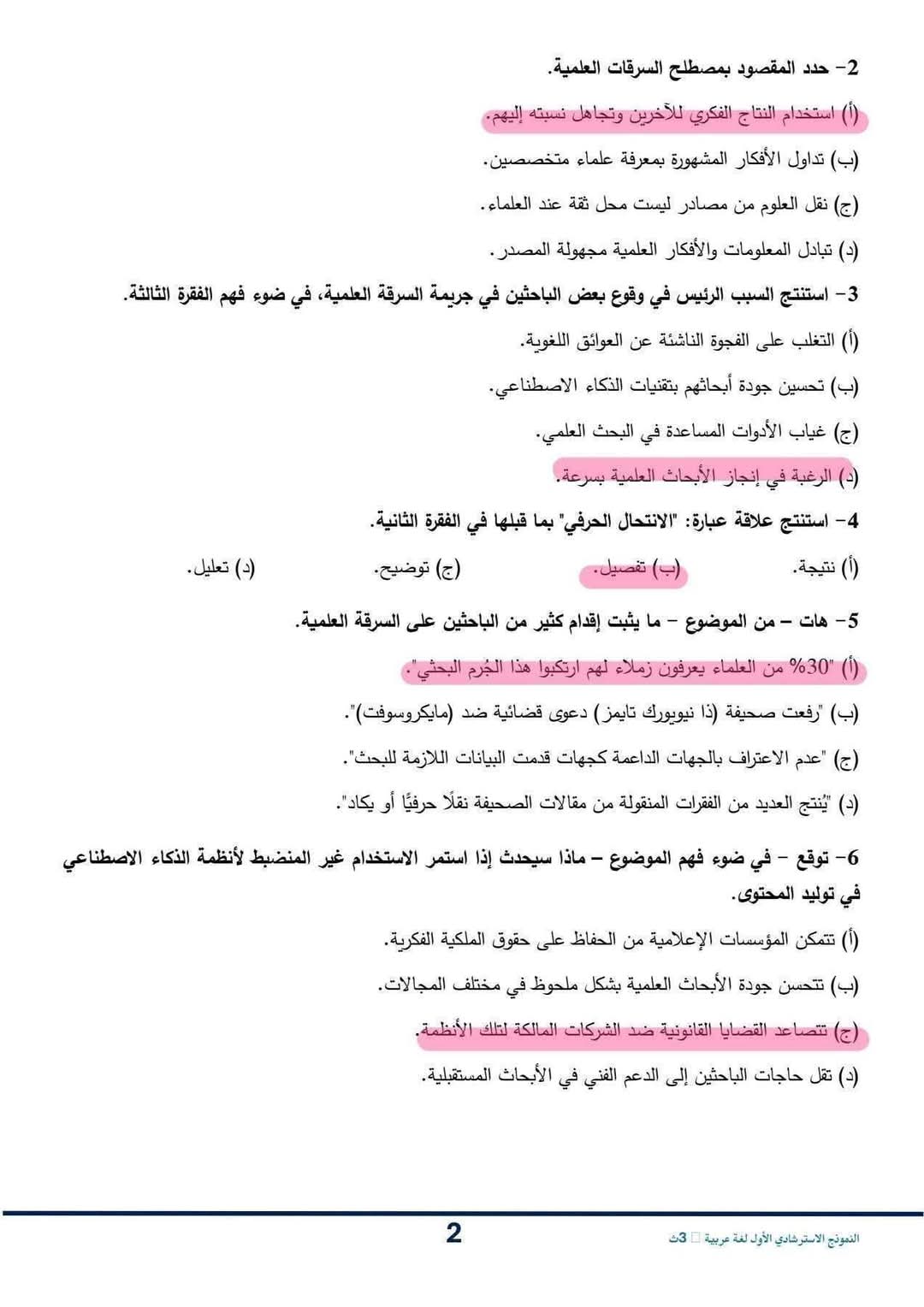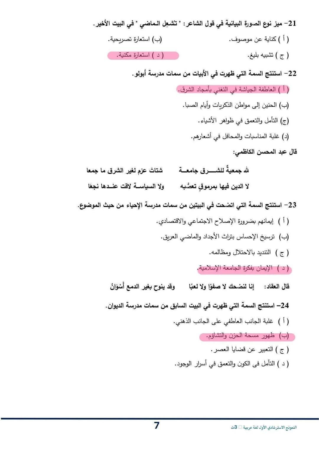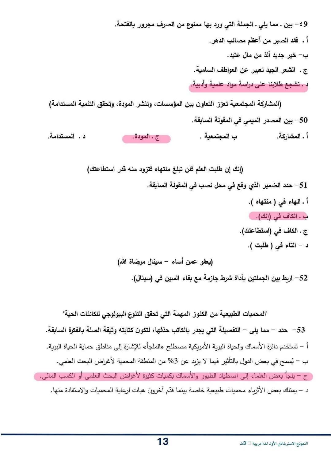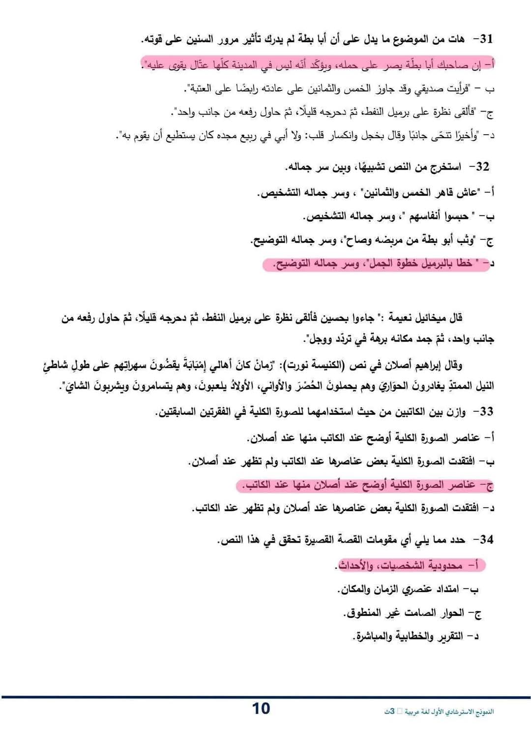 حل النموذج الاسترشادي للصف الثالث الثانوي اللغة العربية