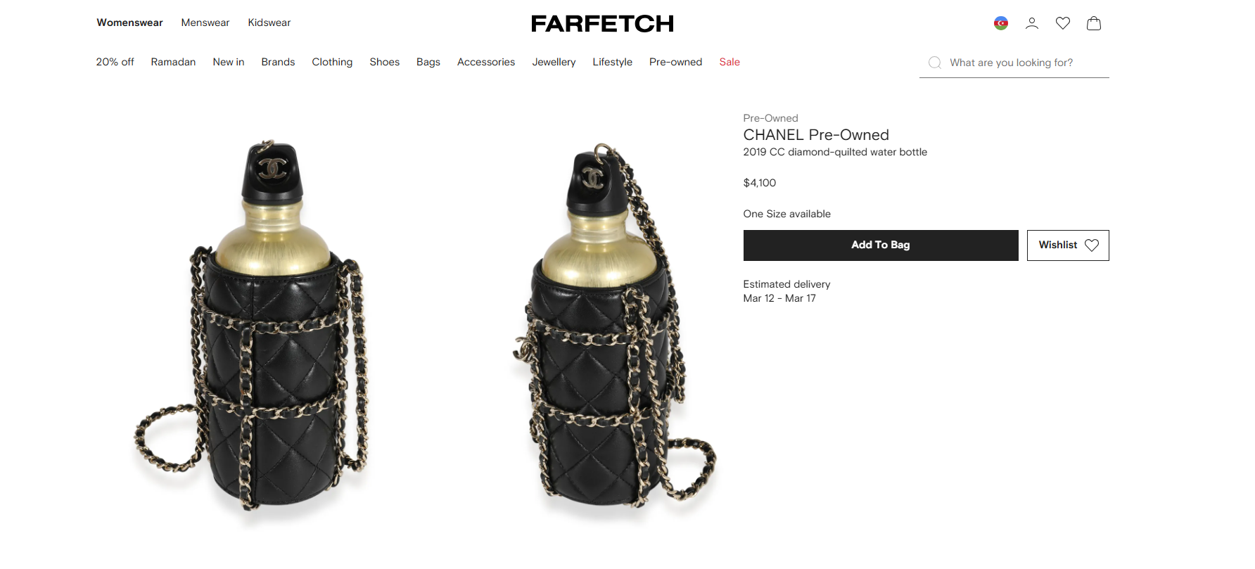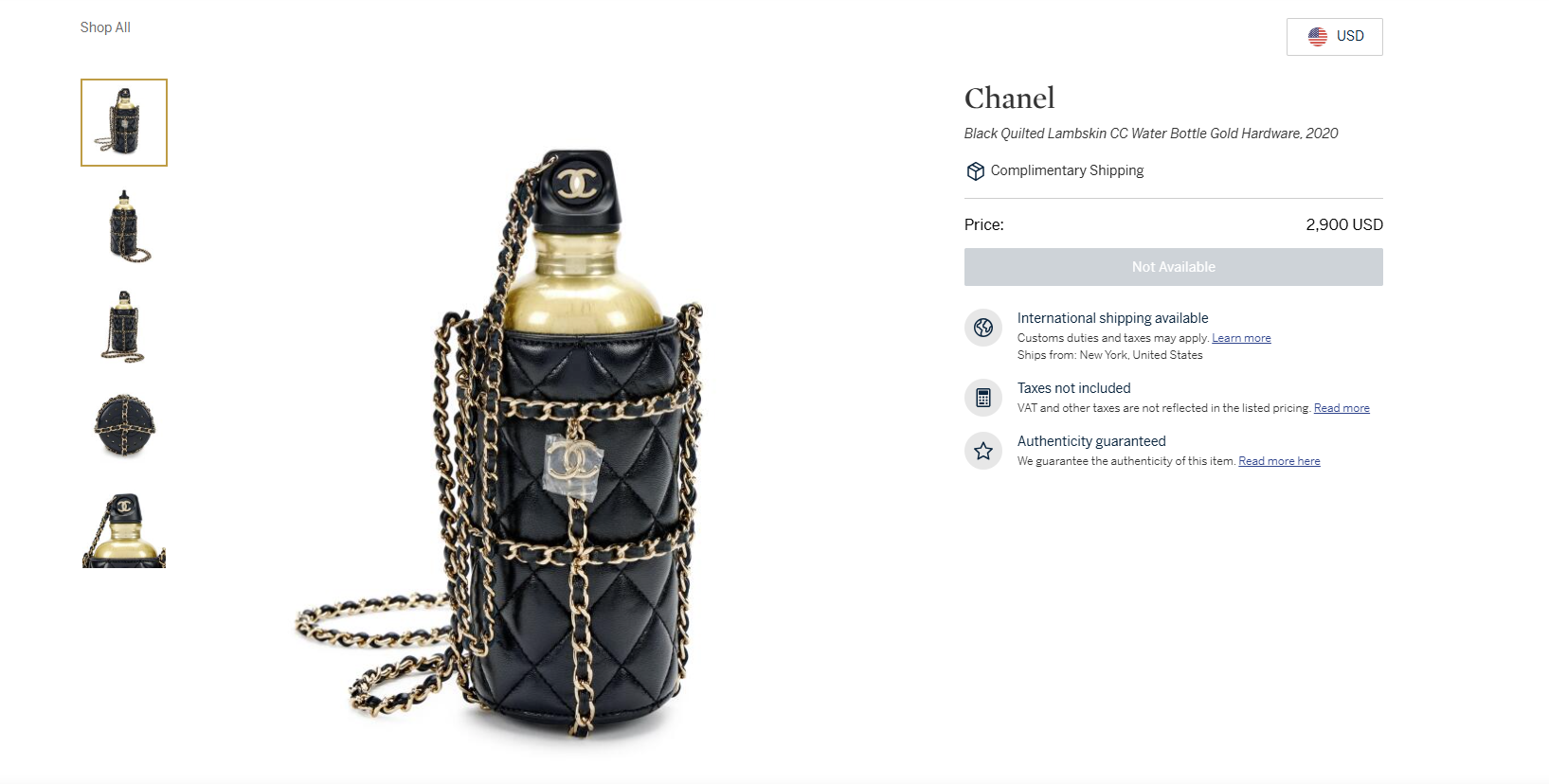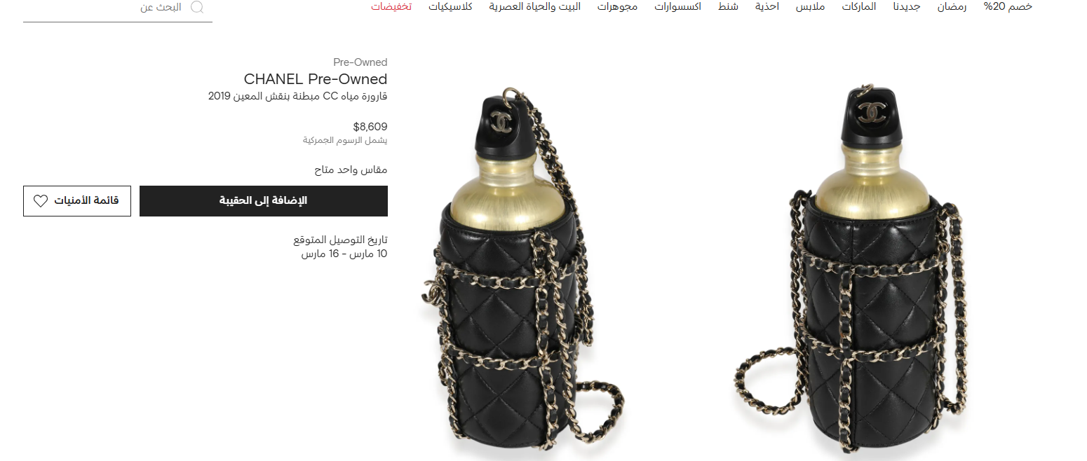 على مواقع المتاجر الدولية ظهرت “الفلاسك” مع وصف: حقيبة شانيل سوداء مبطنة مصنوعة من جلد خروف أسود فاخر، وزجاجة الماء المعدنية الذهبية، هي مصممة بطريقة عصرية وتتميز بنمط ماسي كلاسيكي مُبطّن يُجسّد الأناقة والشياكة.