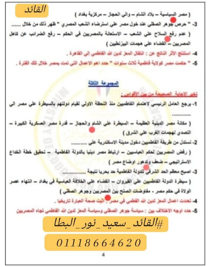 حل التقييم الرابع تاريخ الصف الثاني الثانوي