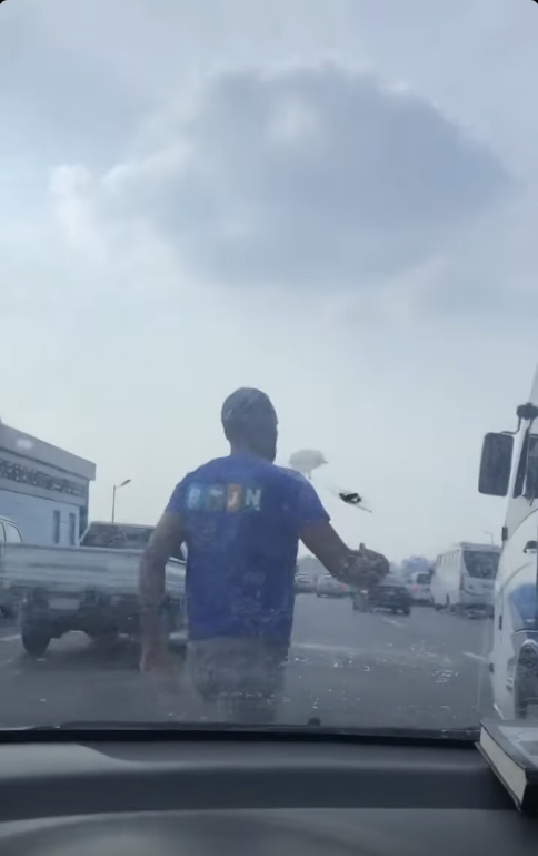 وقال ناشر الفيديو: “وأنا راجع من الشغل على طريق السويس أتوبيس رمى عليا، فتحت الازاز وبشاور ليه لقيته جاي ورايا جري، ونزل من الأتوبيس وبيرزع على الباب، وكان عايز يكسر إزاز الباب، وبعدين كسر إزاز السقف، ده كله عشان رمى عليا وأنا عاتبته، أنا مش عايز حاجة غير حقي، ولو غلطان مستعد اتعاقب".