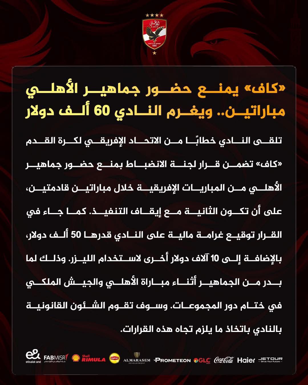 تلقى النادي الأهلي خطابًا رسميًا من الاتحاد الأفريقي لكرة القدم “كاف”، تضمن قرار لجنة الانضباط بمنع حضور جماهير الأهلي من المباريات الإفريقية خلال مباراتين قادمتين، على أن تكون الثانية مع إيقاف التنفيذ.