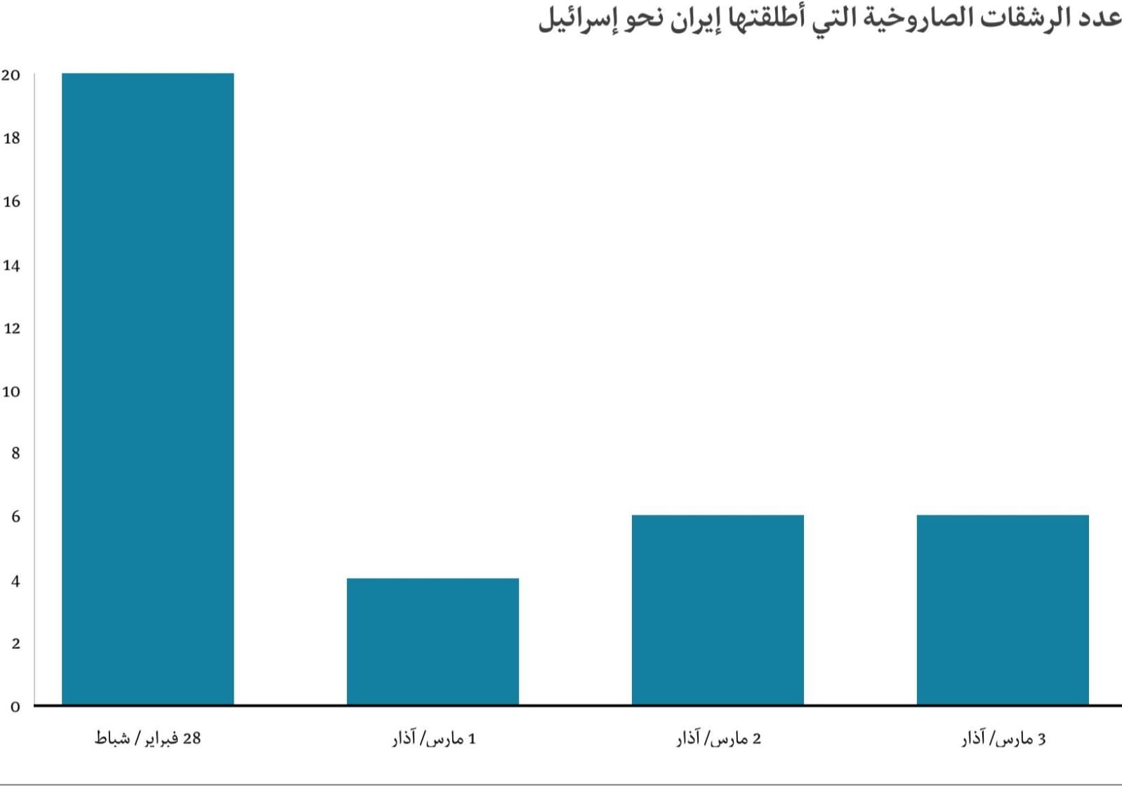 خلال الأيام الأربعة الأولى من الحرب، استهدفت إيران إسرائيل بنحو 36 رشقة صاروخية، وفق تقديرات مشروع التهديدات الحرجة التابع لمعهد المشاريع الأمريكية، فيما قدّر معهد دراسات الأمن القومي الإسرائيلي في تل ابيب إجمالي الصواريخ التي أُطلقت بنحو 128 صاروخًا، حتى الأربعاء الماضي.