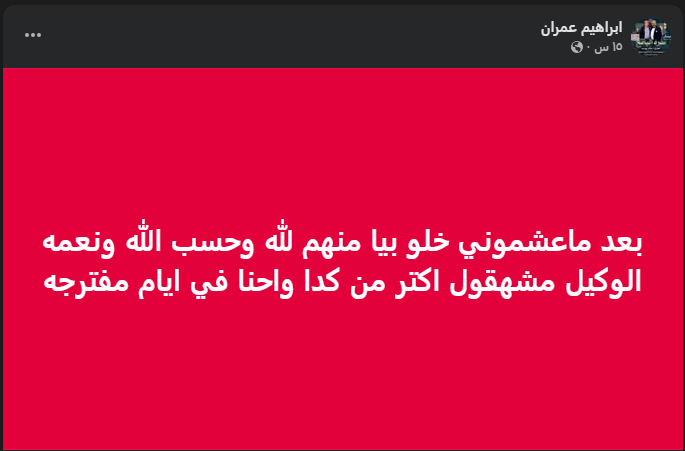 ونشر إبراهيم عمران الرسالة عبر حسابه الشخصي بموقع "فيسبوك"، وقال فيها: "بعد ما عشموني خلوا بي، منهم لله وحسبي الله ونِعم الوكيل، مش هقول أكتر من كده وإحنا في أيام مفترجة".