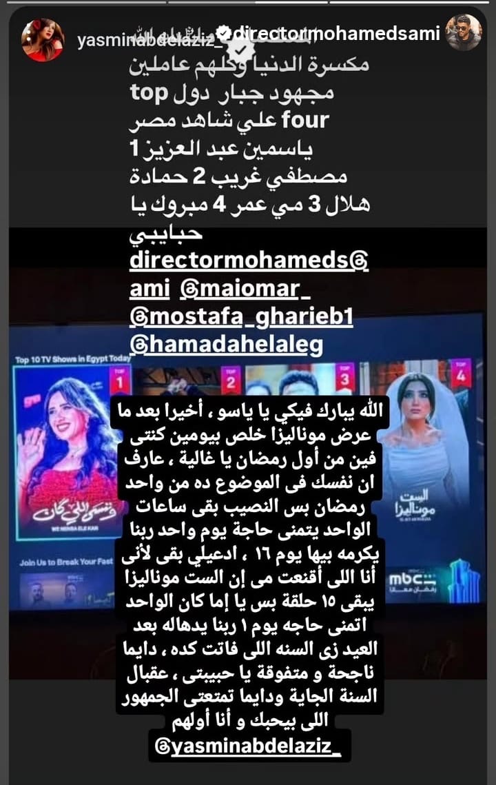 ومن جانبه، أثار المخرج محمد سامي الجدل برسالة نارية، قائلًا: "الله يبارك فيكِ يا ياسو، أخيرًا بعد ما عرض موناليزا خلص بيومين، كنتِ فين من أول رمضان يا غالية؟ عارف إن نفسك في الموضوع ده من يوم واحد رمضان، بس النصيب بقى، ساعات الواحد يتمنى حاجة يوم واحد وربنا يكرمه بيها يوم 16".