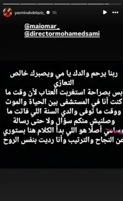 وعلى الجانب الآخر، علقت مي عمر عبر حسابها الرسمي على "إنستجرام" على الجدل المثار بينها وبين ياسمين عبد العزيز حول ترتيب المشاهدات، قائلة: “بصراحة كنت أتمنى أول مرة تعملي لي تاج فيها تبقى في تعزية أو كلمة طيبة على وفاة والدي، مش في بوست ترتيب المسلسلات. عموماً، شكراً، ربنا ما يوريكي أحزان”.