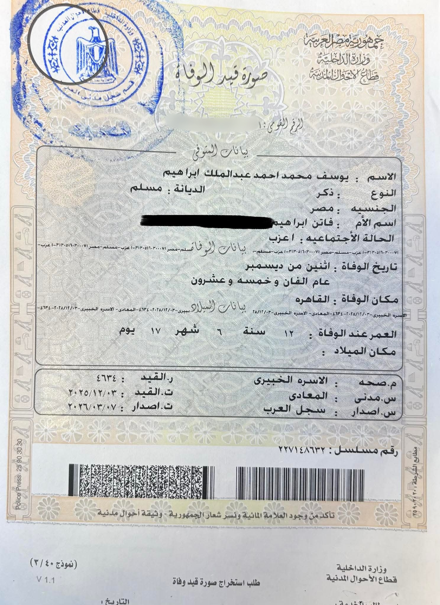 وفي منشور مؤثر عبر حسابه على موقع فيسبوك، روى والد الضحية تفاصيل اللحظة التي اضطر فيها لاستخراج شهادة وفاة نجله، قائلاً: "في لحظة من أصعب لحظات حياتي.. وقفت أمام موظف السجل المدني لأستخرج شهادة وفاة ابني يوسف".