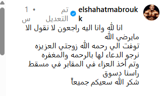 وقال الشحات مبروك عبر “إنستجرام”: "إنا لله وإنا إليه راجعون لا نقول إلا مايرضي الله، توفيت إلى رحمة الله زوجتي العزيزة، نرجو الدعاء لها بالرحمة والمغفرة، وتم أخذ العزاء في المقابر في مسقط رأسنا دسوق، شكر الله سعيكم جميعاً".