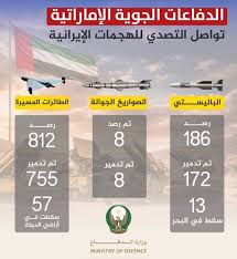 رصدت الإمارات إطلاق نحو 174 صاروخًا باليستيًا تجاه الدولة، نجحت الدفاعات الجوية في اعتراض 161 صاروخًا، بينما سقط عدد محدود في البحر أو خارج المناطق الحيوية.
