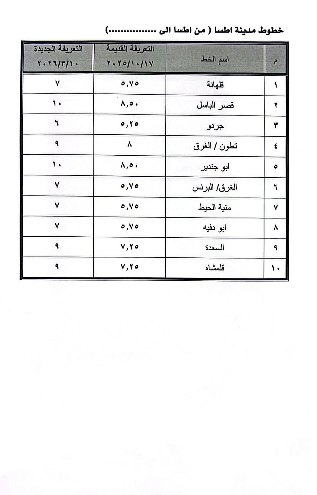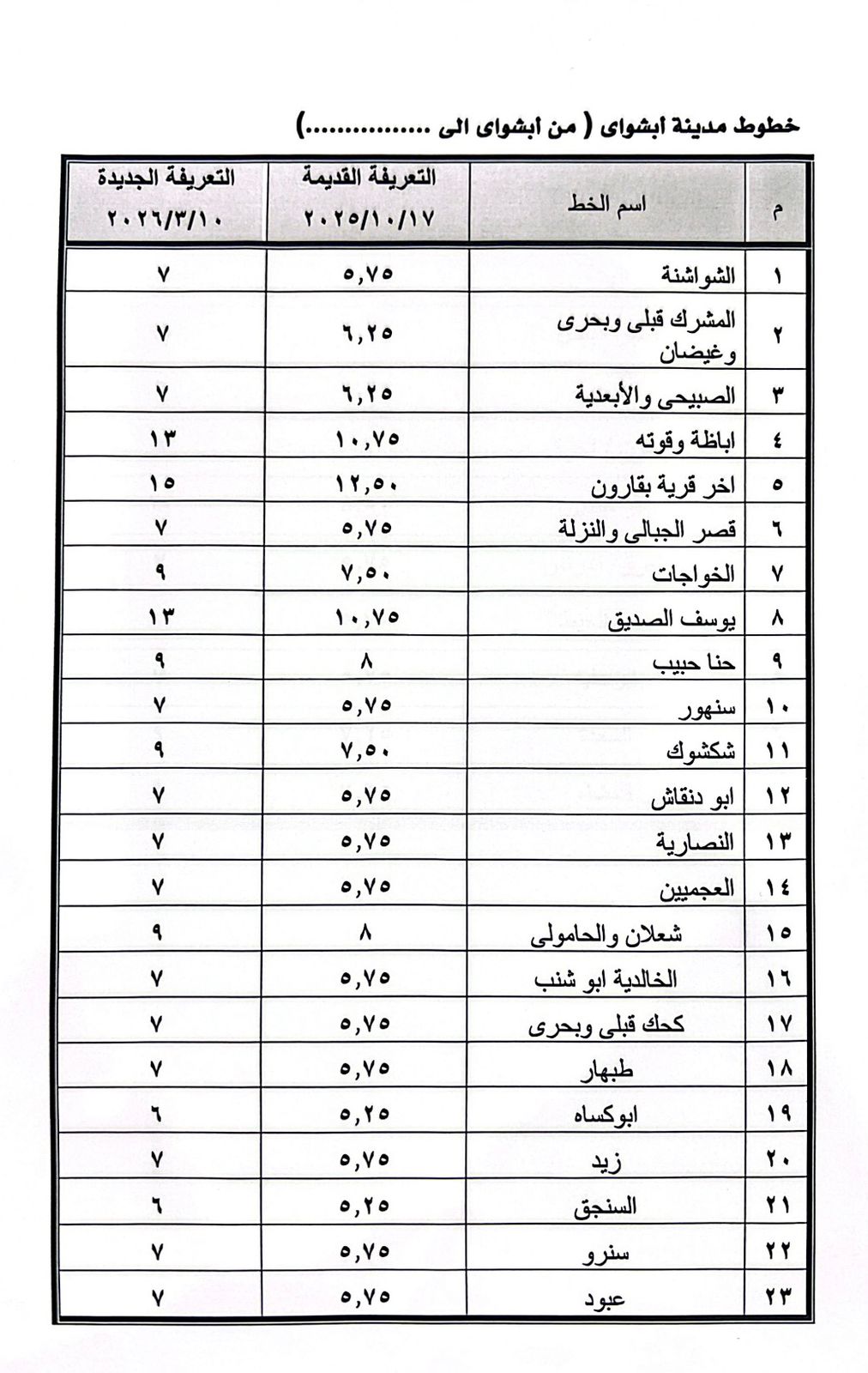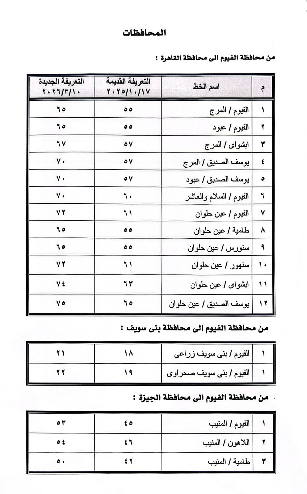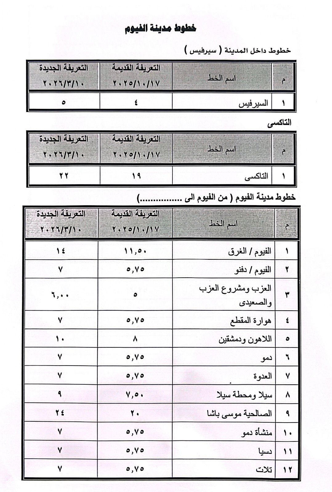 أعلنت محافظة الفيوم تعريفة الركوب الجديدة لخطوط سير سيارات السرفيس والتاكسي وسيارات الأجرة العاملة على الخطوط الداخلية والخارجية بين مراكز المحافظة والمحافظات الأخرى، وذلك عقب إعلان لجنة التسعير التلقائي للمنتجات البترولية تحريك أسعار البنزين والسولار بدءا من صباح اليوم الثلاثاء 10 مارس 2026.