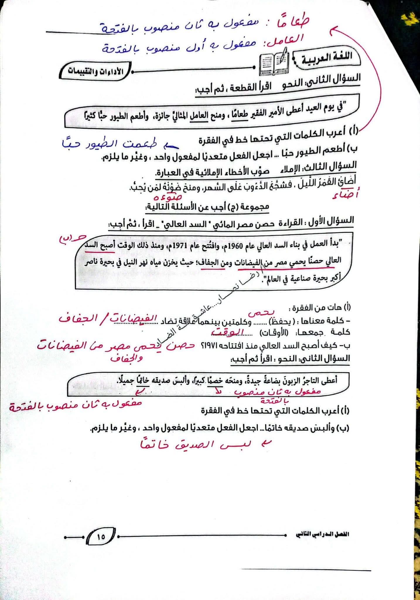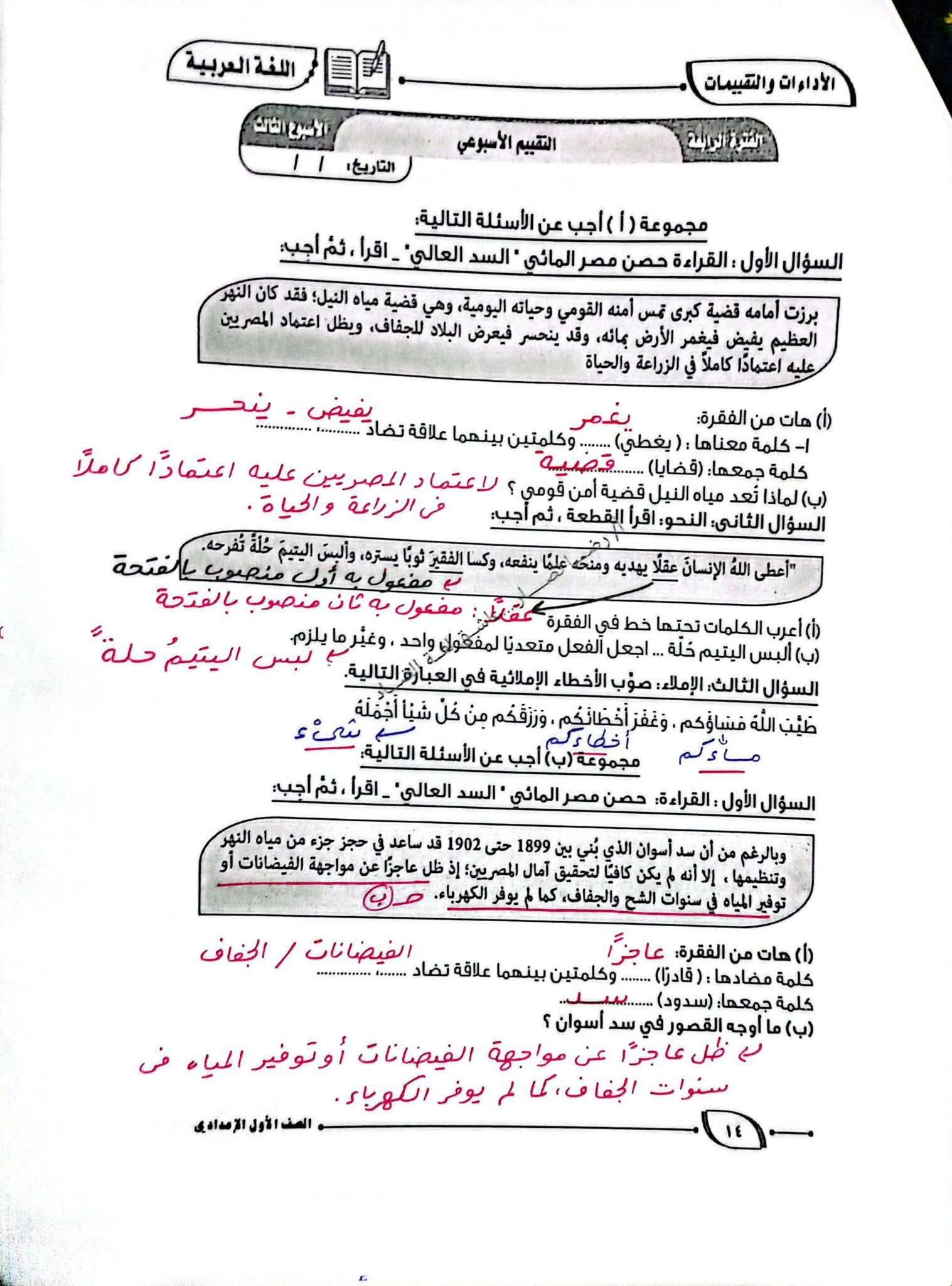 التقييم الأسبوعي للصف الثاني الإعدادي عربي الاسبوع الثالث