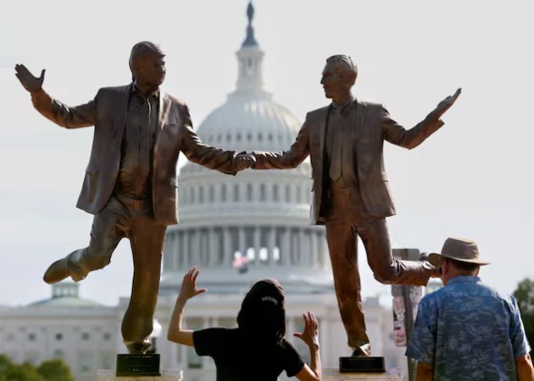 ظهر تمثال في ساحة ناشونال مول في واشنطن، يجسد الرئيس الأمريكي دونالد ترامب والملياردير جيفري إبستين الذي جرى اتهمه قبل موته بالسجن في أكبر ملف قضايا جنسية في العالم، وهما يعيدان تمثيل مشهد شهير من فيلم تيتانيك (إنتاج 1997).