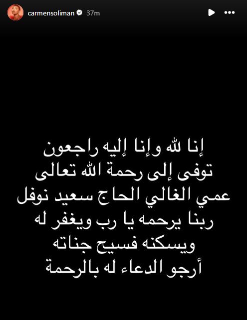 ونشرت كارمن سليمان عبر خاصية “الاستوري” على حسابها بموقع إنستجرام منشورًا نعت فيه عمها، وكتبت: