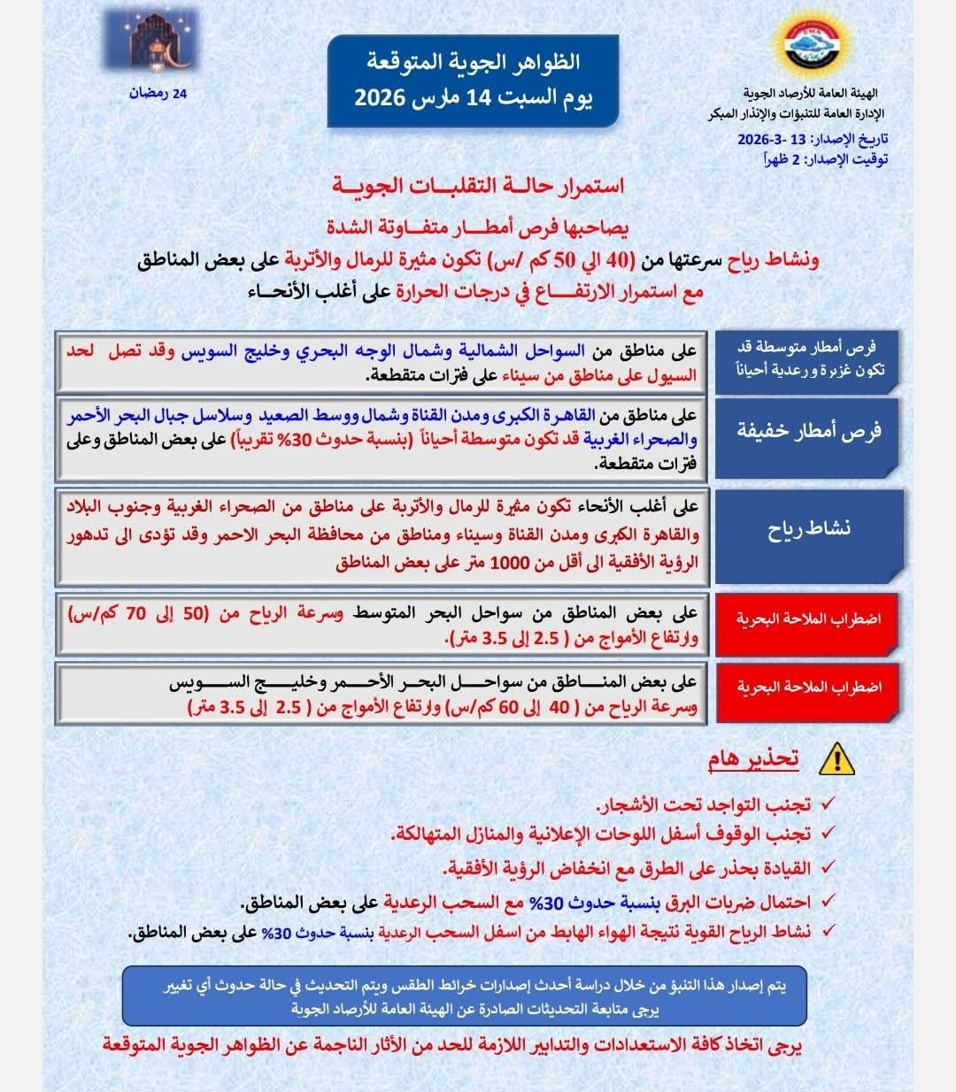 تشهد حالة الطقس اليوم السبت 24 رمضان 2026 استمرار حالة عدم الاستقرار في الأحوال الجوية، حيث تتكون سحب رعدية على عدد من المناطق يصاحبها سقوط أمطار متفاوتة الشدة، إلى جانب نشاط للرياح تتراوح سرعتها بين 40 و50 كم/س، ما قد يؤدي إلى إثارة الرمال والأتربة خاصة في المناطق المكشوفة.