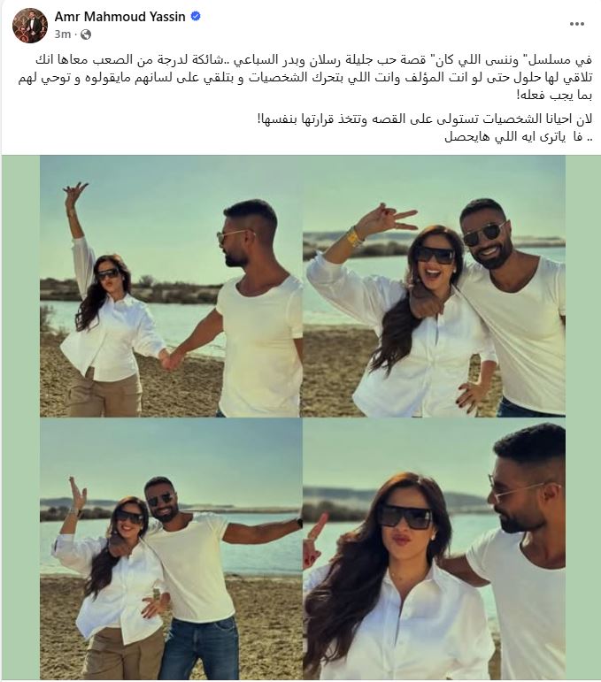 ونشر عمرو محمود ياسين عبر حسابه الرسمي على موقع “فيسبوك” صورًا للفنانة ياسمين عبدالعزيز برفقة الفنان كريم فهمي، معلقًا على مسلسل "وننسى اللي كان" قائلاً: "قصة حب جليلة رسلان وبدر السباعي شائكة لدرجة من الصعب معها أن تجد لها حلول، حتى لو كنت المؤلف الذي يحرك الشخصيات، وتلقي على لسانهم ما تقول، وتوحي لهم بما يجب فعله، أحيانًا، الشخصيات تستولي على القصة وتتخذ قراراتها بنفسها! فإلى أين ستأخذنا الأحداث؟".