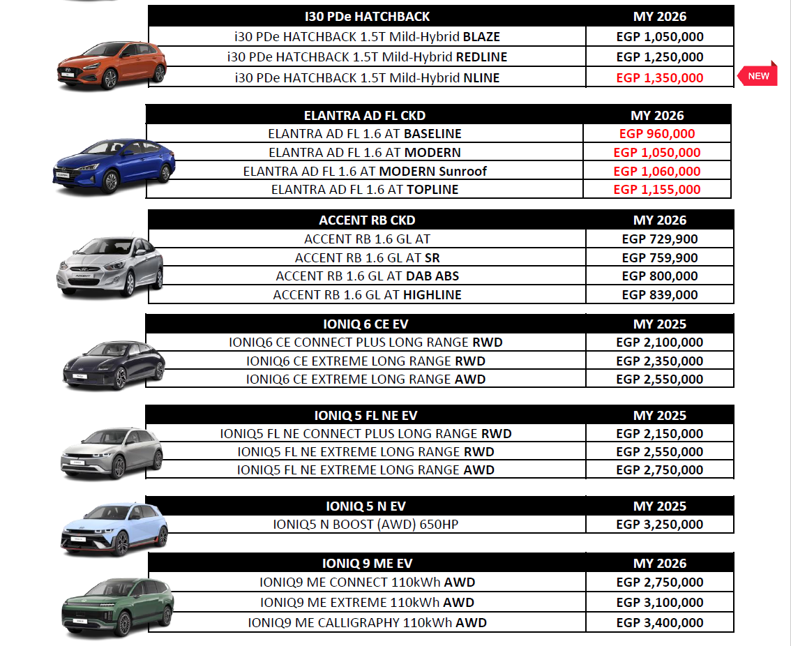 أعلنت مجموعة جي بي أوتو وكيل علامة هيونداي في مصر، قائمة أسعار أسعار سيارات هيونداي 2026 في مصر بعد زيادة 3 طرازات.